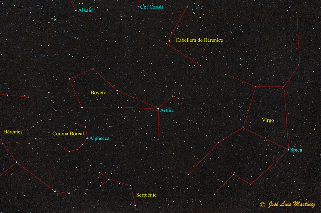 Hacia el oeste del Boyero nos encontramos con siete estrellas en forma de semicircunferencia, es la constelación Corona boreal y a continuación vendrían las constelaciones de verano. Hacia el sur de Virgo nos encontramos con las pequeñas Cuervo y Copa (Cráter), la escurridiza y pequeña Sextante y la larga Hydra.