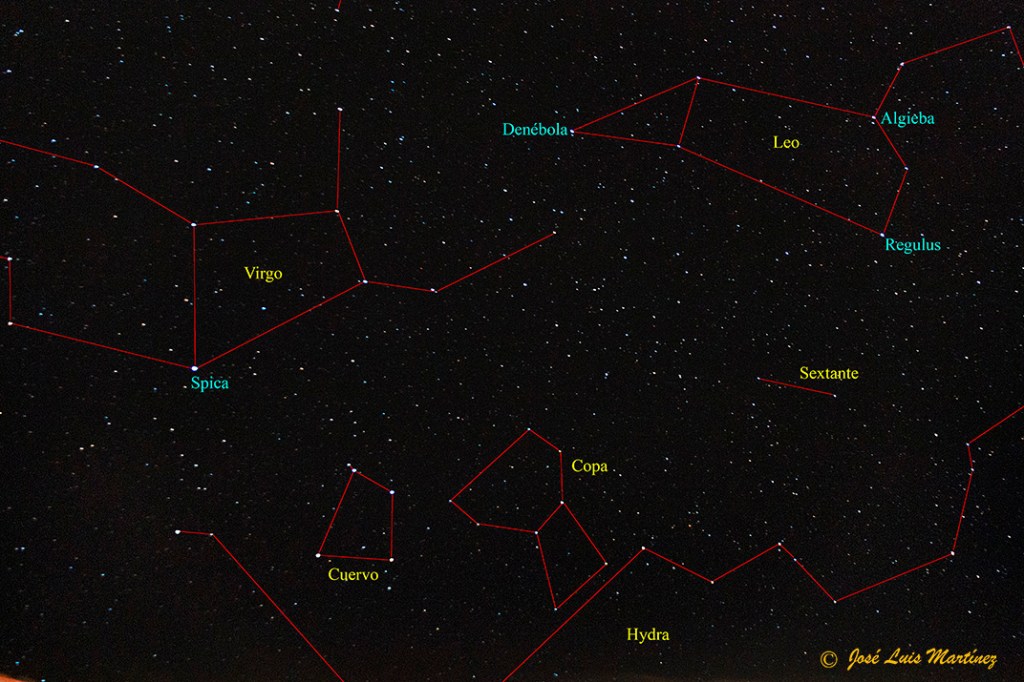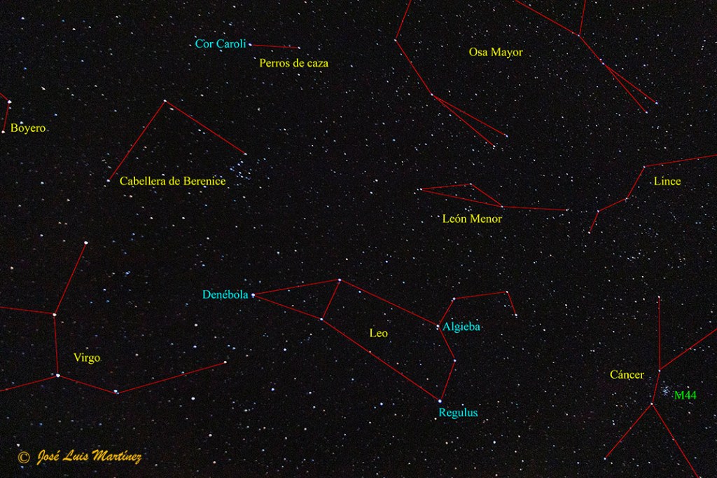 Finalmente, por encima de Leo está la escurridiza León Menor, el Lince y de nuevo la famosa circumpolar Osa Mayor. Por el lado de la cabeza de Leo, y de la Hydra, tenemos a la constelación de la eclíptica Cáncer, con M44, el Pesebre, precioso cúmulo abierto visible a simple vista como una mancha difusa en cielos oscuros. A partir de Cáncer ya vendrían las constelaciones de invierno.