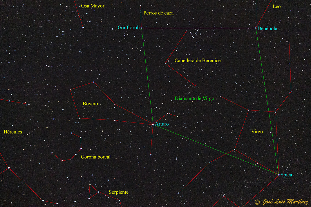 En el cielo de primavera encontramos también otro asterismo, el Diamante de Virgo; en este caso es un cuadrilátero en forma de casi un trapecio rectángulo, en los vértices del cual se encuentran las estrellas Arturo, Spica, Denébola (β Leo) y Cor Caroli (α CVn). En la imagen siguiente podemos ver este asterismo.
