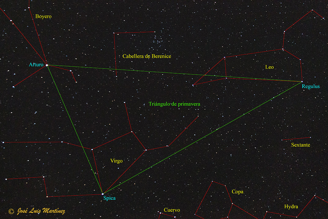 Como he comentado, no es un cielo que destaque por estrellas brillantes; en concreto, son tres las estrellas más brillantes de este cielo, las cuales son las estrellas más brillantes de las tres constelaciones que presiden el cielo de primavera: Arturo del Boyero (Bootes), Spica de Virgo y Regulus de Leo. Además, estas tres estrellas forman el Triángulo de primavera, un enorme asterismo en forma de triángulo en cuyos vértices se encuentran las tres estrellas mencionadas.