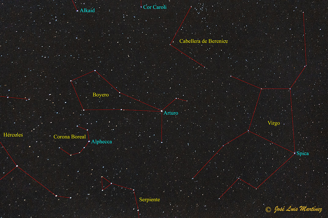 Hacia el oeste del Boyero nos encontramos con siete estrellas en forma de semicircunferencia, es la constelación Corona boreal y a continuación vendrían las constelaciones de verano. Hacia el sur de Virgo nos encontramos con las pequeñas Cuervo y Copa (Cráter), la escurridiza y pequeña Sextante y la larga Hydra.