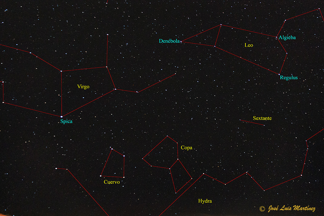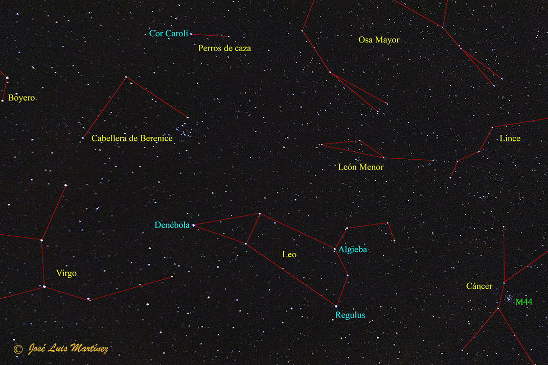 Finalmente, por encima de Leo está la escurridiza León Menor, el Lince y de nuevo la famosa circumpolar Osa Mayor. Por el lado de la cabeza de Leo, y de la Hydra, tenemos a la constelación de la eclíptica Cáncer, con M44, el Pesebre, precioso cúmulo abierto visible a simple vista como una mancha difusa en cielos oscuros. A partir de Cáncer ya vendrían las constelaciones de invierno.
