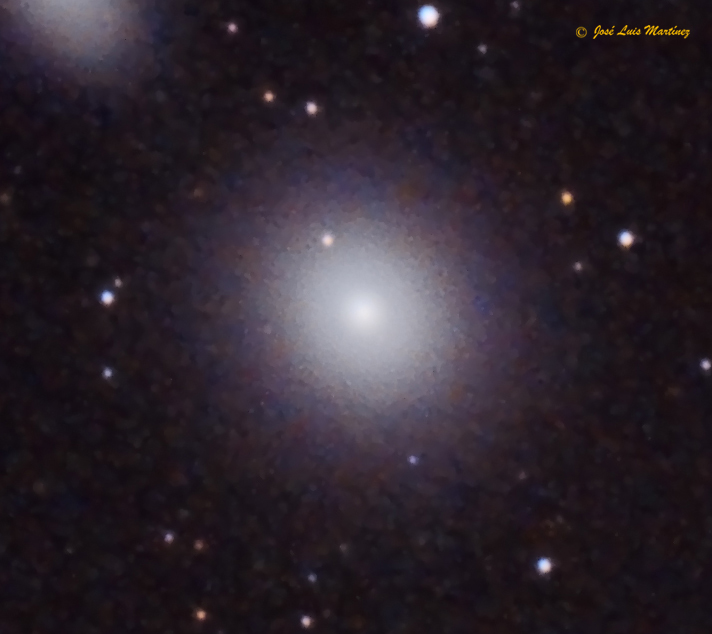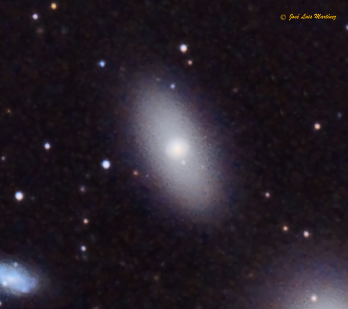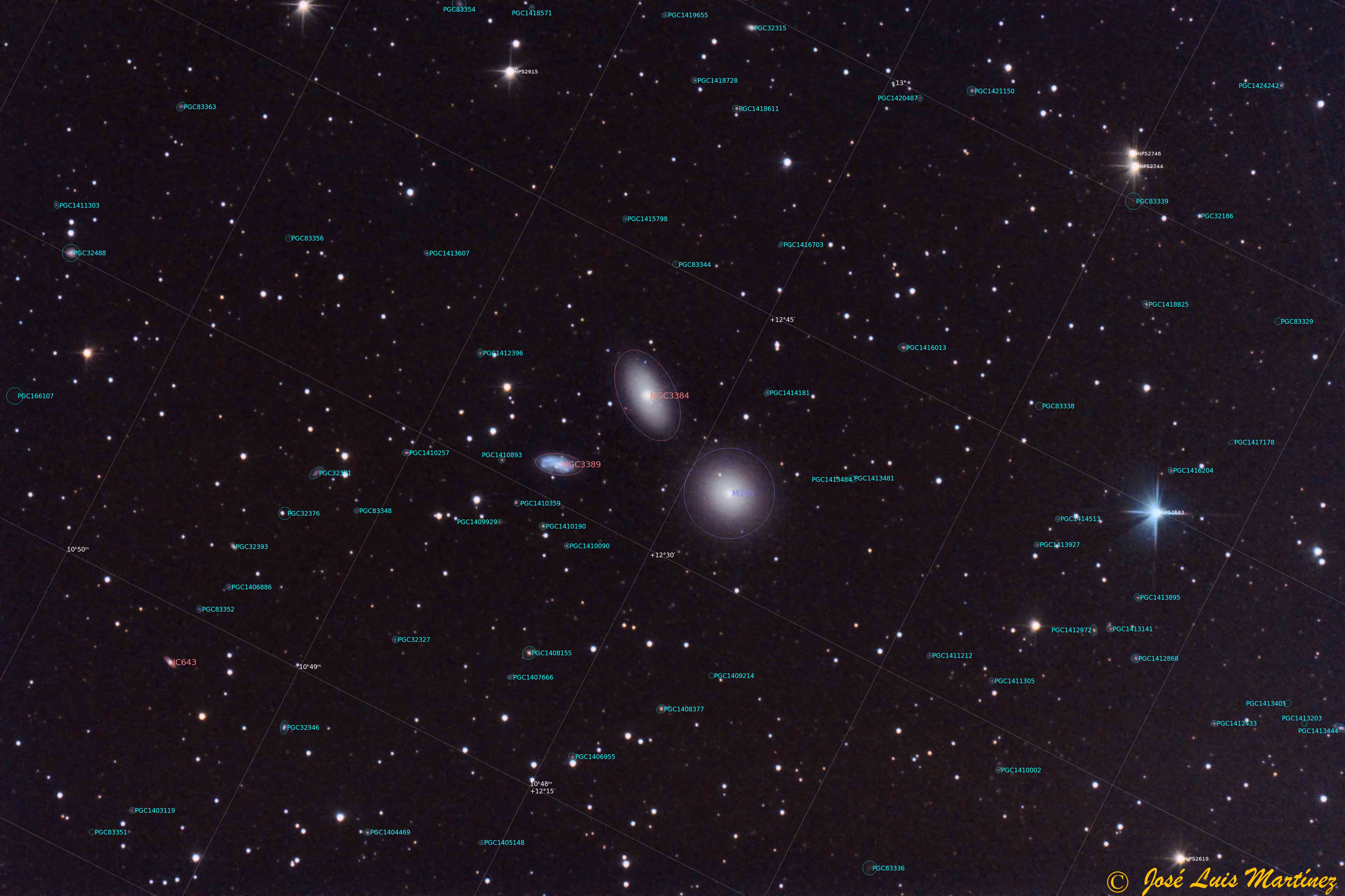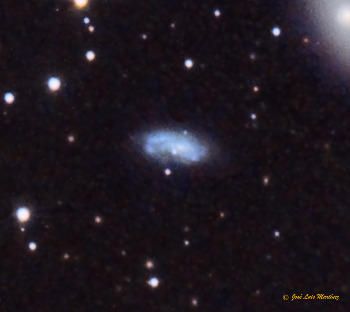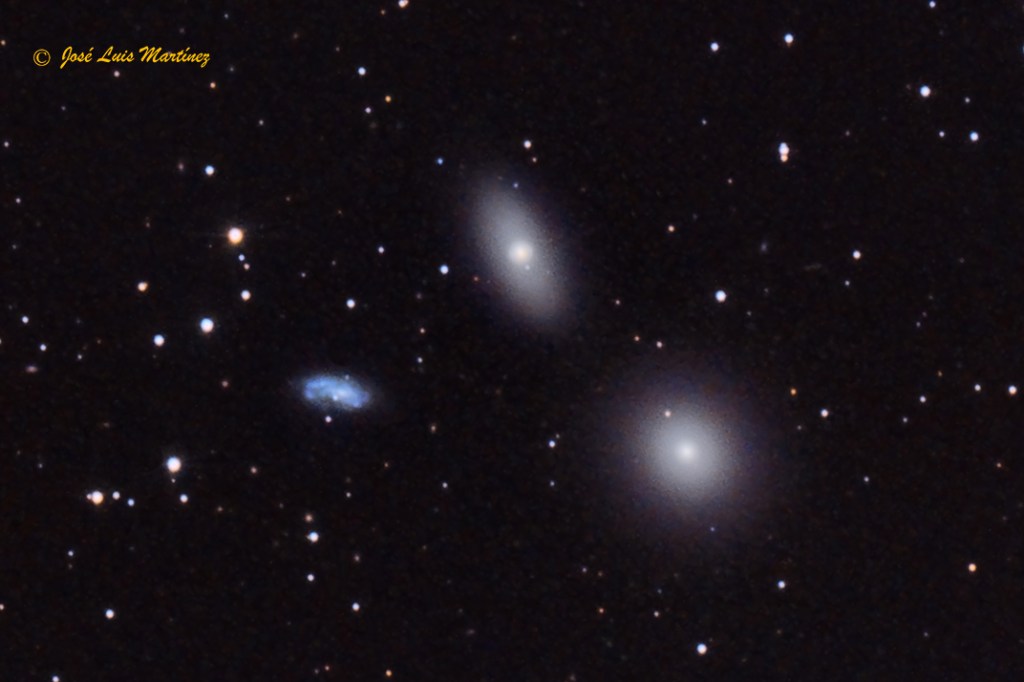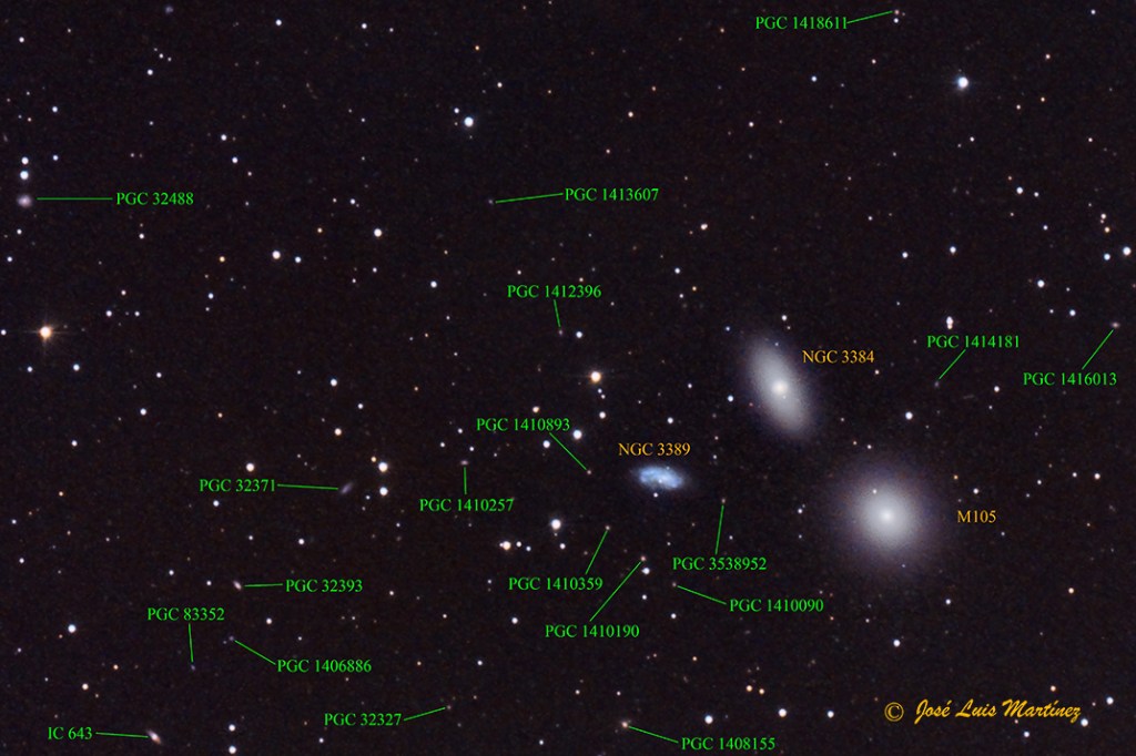 NGC 3389, incluida también en el mismo catálogo como NGC 3373 y en el de Galaxias Principales como PGC 32306, es una galaxia espiral que se encuentra a unos 74 millones de años luz de distancia y que tiene una magnitud aparente de 12,8, un brillo superficial de 13,9 mag/min arco2 y un tamaño aparente de 2,7 x 1,2 minutos de arco. Es una galaxia relativamente joven, con estrellas jóvenes que le dan ese tono azulado y que, como ya he mencionado, no pertenece al grupo Leo I; la vemos en el mismo campo por nuestra perspectiva terrestre.