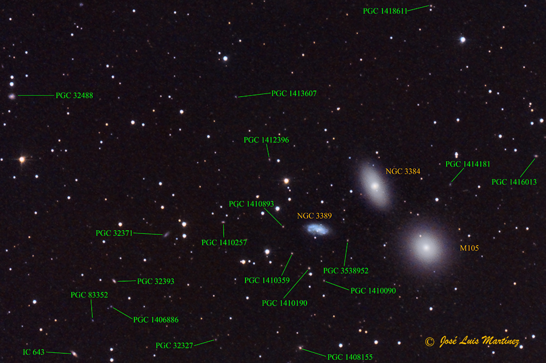 La siguiente fotografía, realizada desde Querol el día 1 de junio de 2019 con un telescopio reflector Skywatcher 200/1000 y una cámara Canon EOS 70D, es de estas tres galaxias. La de más abajo y más a la derecha y con forma circular es M105; un poco más arriba y a la izquierda de M105 está NGC 3384, la cual es más alargada; finalmente, la que está más a la izquierda de las tres y de un tono más azulado es NGC 3389.