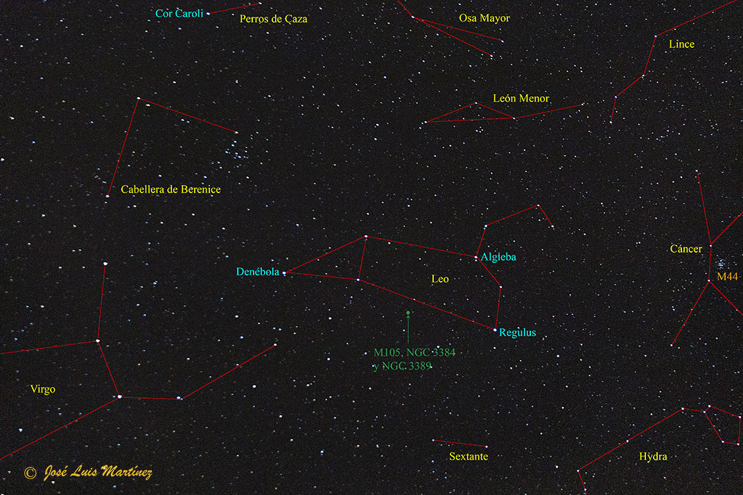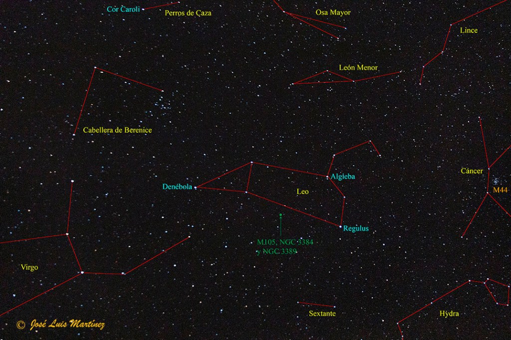 En la constelación de Leo hay varias galaxias. Algunas de ellas las podemos ver en un mismo campo, como el Trío de Leo (M65, M66 y NGC 3628), famoso trío de galaxias entre los aficionados a la astronomía, o como otro trío no tan famoso, el formado por las galaxias M105, NGC 3384 y NGC 3389, de las que trata el presente artículo.