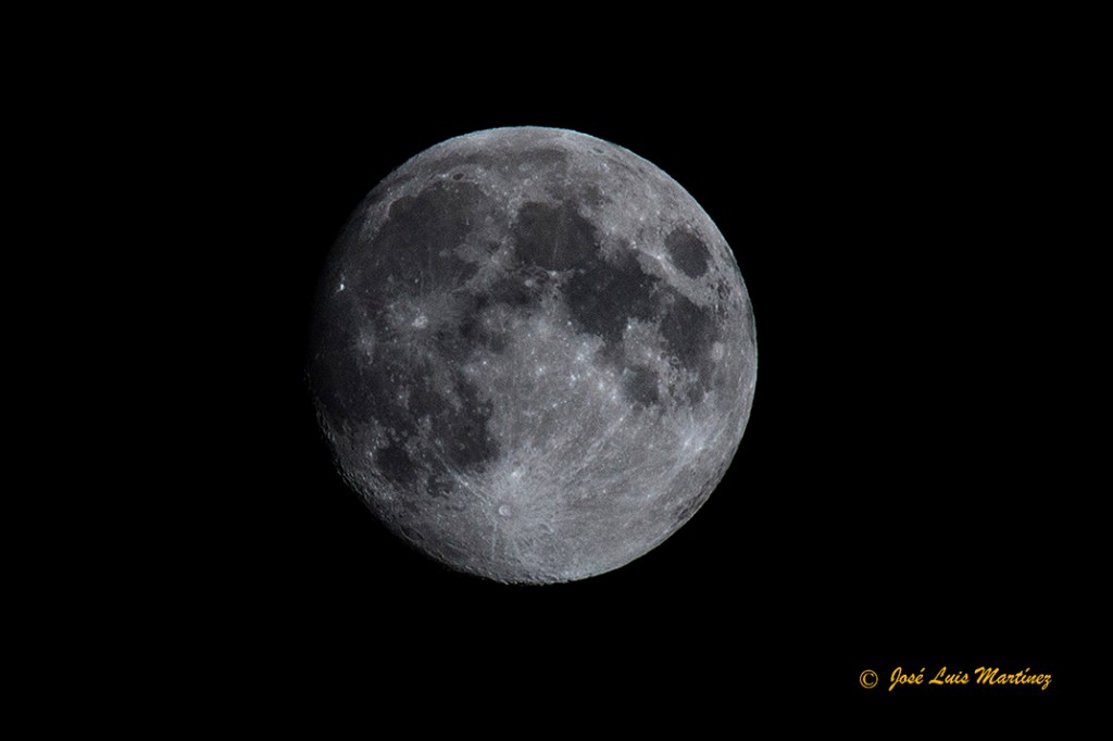 Cuando me iba a dormir me asomé y vi que las nubes se habían ido y el cielo estaba raso de nuevo. Como ya era tarde para volver a montar todo (la una de la madrugada), cogí de nuevo la cámara y el teleobjetivo y le hice una foto. No es lo mismo que con el telescopio, pero, como se puede ver, no hace falta un telescopio para fotografiar la Luna.