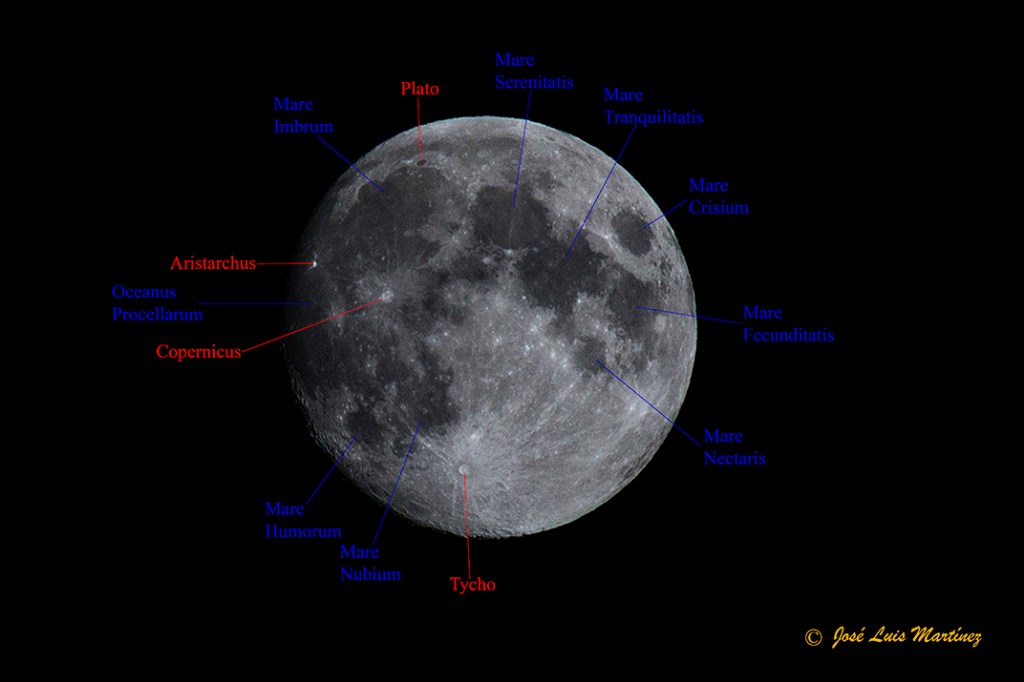 Así que, con la fotografía anterior me he entretenido en señalar los mares y los cuatro cráteres.