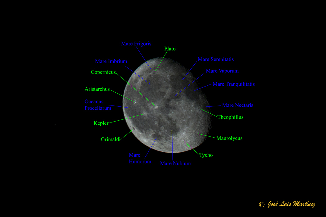 Tampoco llevaba trípode, apoyé la cámara como pude en el balcón del alojamiento y esto es lo que salió. De todas maneras, se pueden apreciar los cráteres más importantes y los mares.
