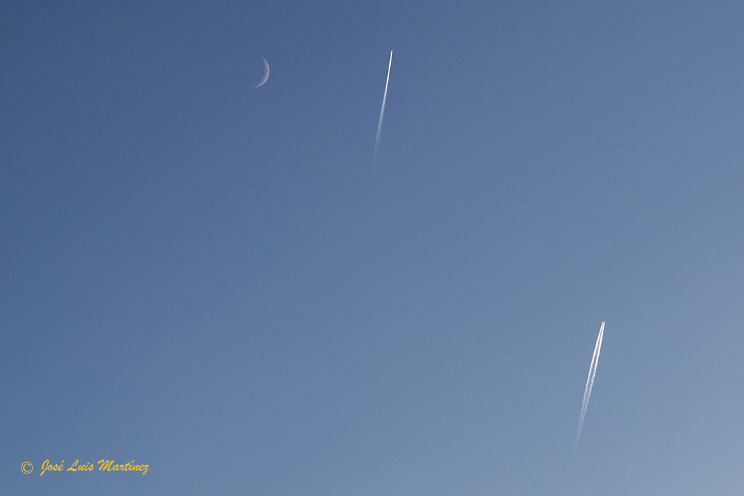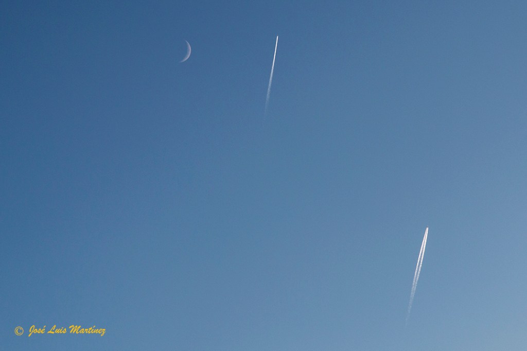 Las fotos las hice con la Canon EOS 70D y los objetivos Canon 15-85 y 70-300. Empecé con el primero y la primera foto es la siguiente, donde las únicas nubes eran las producidas por el vapor de agua de dos aviones.