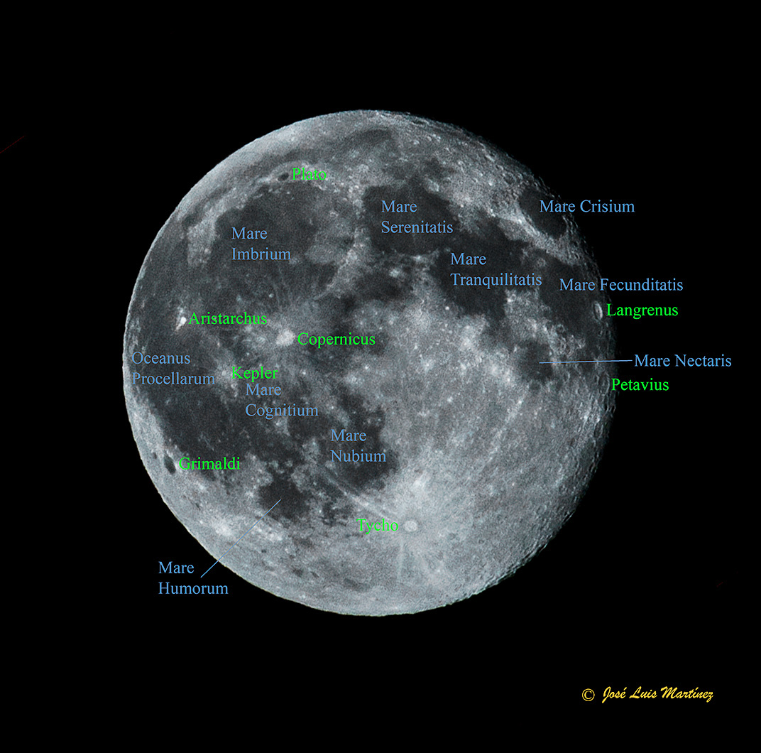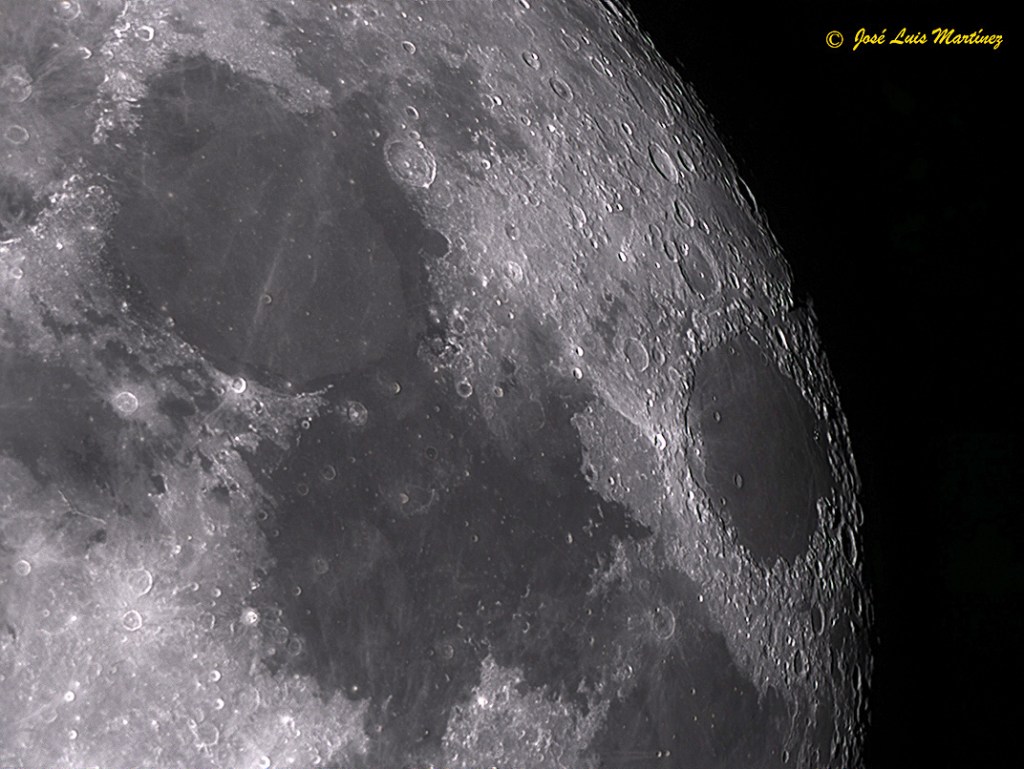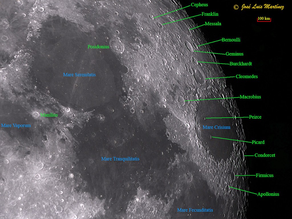 En la imagen anterior, que es la misma que la primera, he puesto los nombres de los cráteres citados, así como de los mares principales.