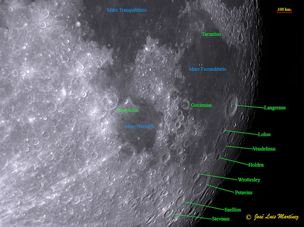 En la zona occidental, en el terminador son observables los cráteres Langrenus y Petavius y, lo que siempre podemos ver cuando la Luna está llena o casi llena, son todos sus mares.