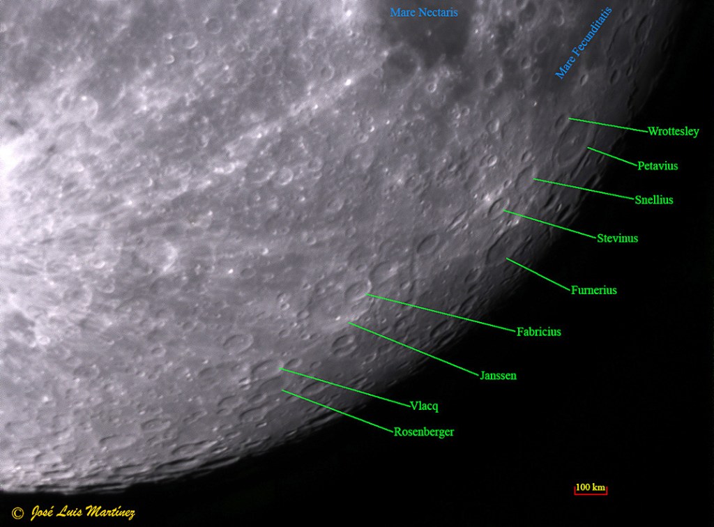 Sin lugar a dudas, en esta zona del terminador, el cráter que más destaca es Petavius, tan interesante como Langrenus y el cual se ve con más detalle en la foto de la zona centro. Situado en el sur del Mare Fecunditatis, Petavius es un cráter de 177 km de anchura y con una pared interna de 3300 metros de altura. En su centro hay un macizo montañoso con cinco picos, de los cuales, el más alto, tiene 1700 metros. Al noroeste de Petavius nos encontramos un pequeño cráter de 57 km de diámetro y 2300 metros de profundidad, es el cráter Wrottesley.