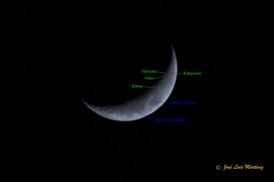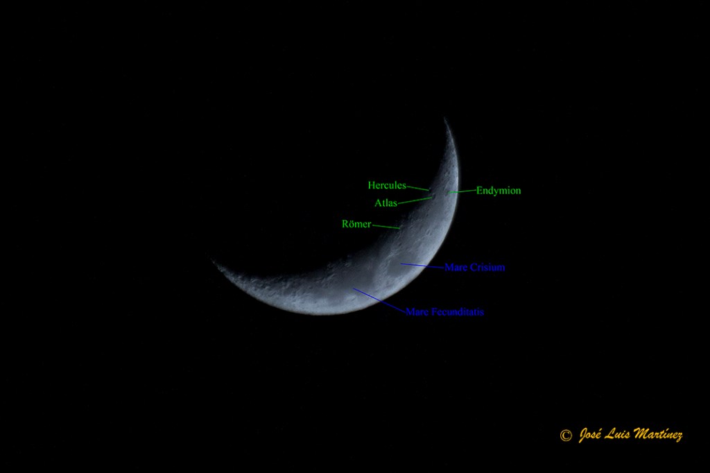 Aunque con telescopio podemos observar unos cuantos cráteres, con el teleobjetivo también es posible observar algunos. En la imagen siguiente, que es la misma que la anterior, he indicado los más importantes, así como el Mare Crisium y parte del Fecunditatis, los únicos mare que se ven con cuatro días.