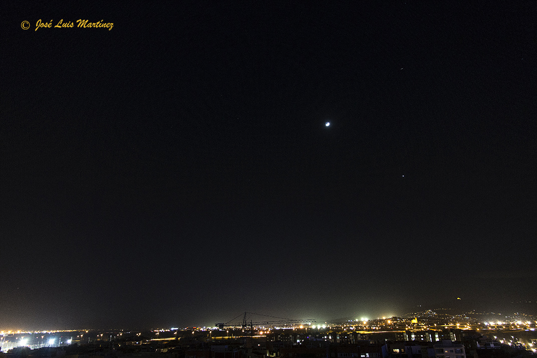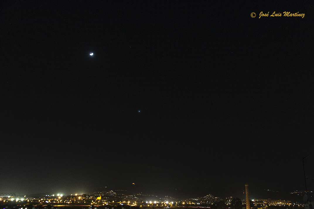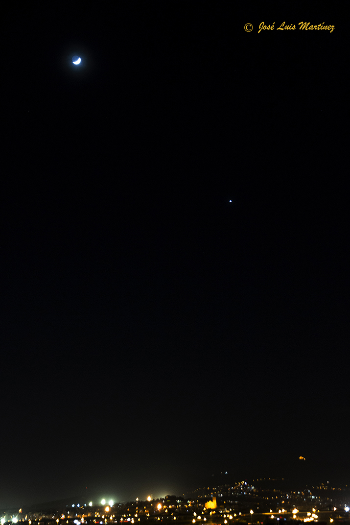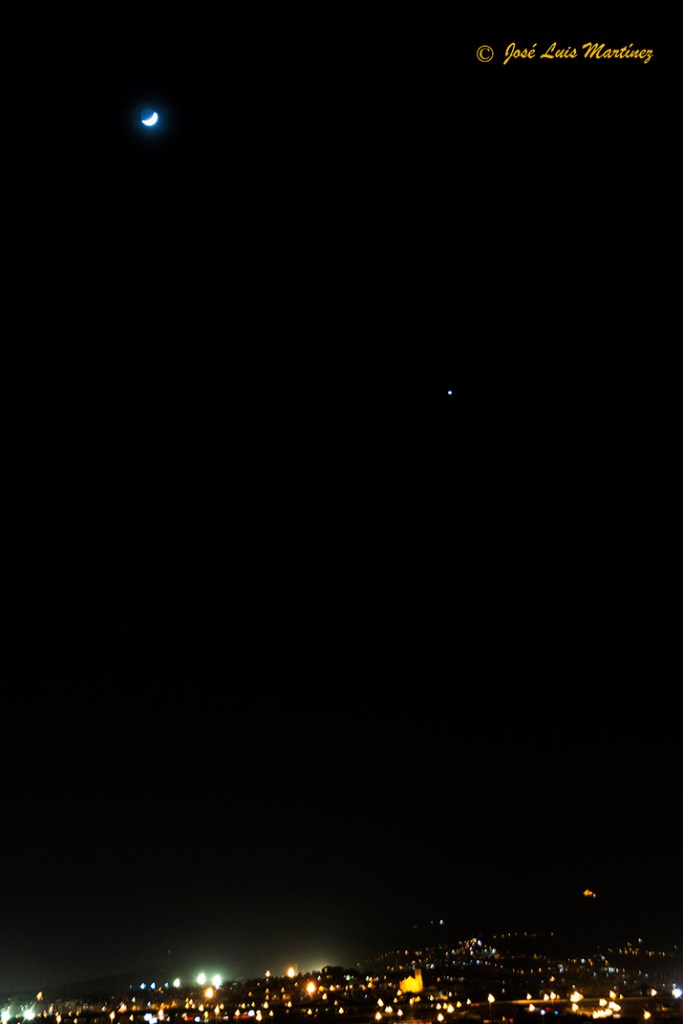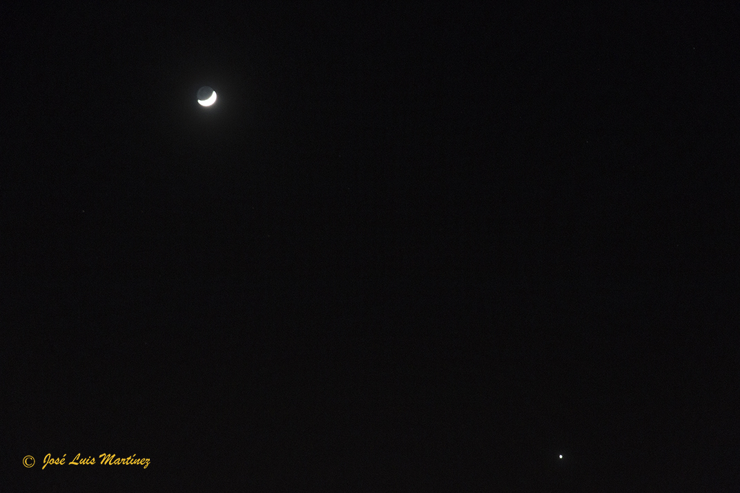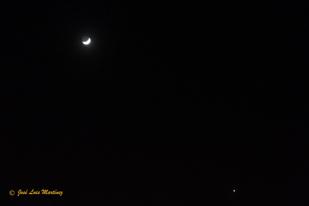 En la imagen anterior podemos ver a la Luna y a Venus bastante próximos en el cielo. Venus es ese puntito que se ve por debajo y hacia la derecha de la Luna. Ya no estaban tan próximos como el día anterior, pero sí bastante.
