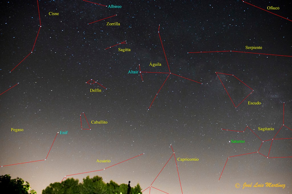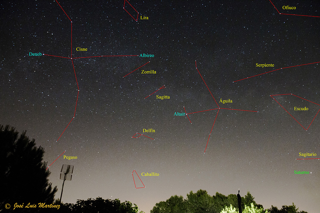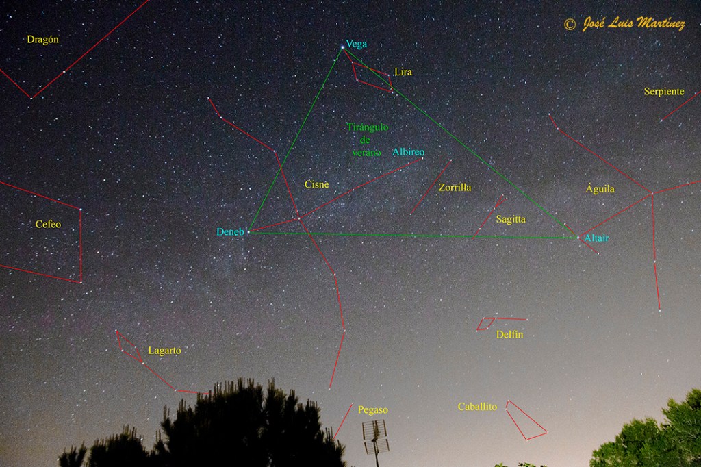 La primera foto que hice fue a la zona del Cisne, en la que, además de esta constelación, tenemos a la Lira, el Águila, Vulpecula (Zorrilla), Sagitta, Delfín y el Caballito. Como están el Cisne, el Águila y la Lira, tenemos también el asterismo que preside las noches de verano en el hemisferio norte, el Triángulo de verano, formado por Deneb del Cisne, Altair del Águila y Vega de la Lira. La siguiente fotografía, que corresponde a esta primera, está realizada, como todas las del artículo, desde Querol con una cámara Canon EOS 70D y un objetivo Canon 15-85.