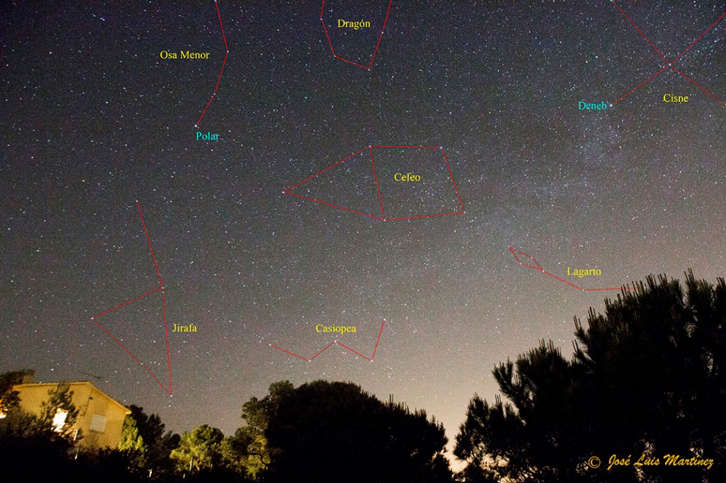Volví a llevar la cámara al Cisne, en concreto al norte de éste, donde las constelaciones que nos encontramos son las circumpolares y que pueden verse todo el año y toda la noche. De esta manera, le hice dos fotos a esta zona, en la que nos encontramos con Cefeo, Casiopea, la Jirafa, la Osa Mayor y el Dragón rodeando a la Osa Menor. Al oeste de la Osa Mayor tenemos ya las constelaciones de primavera de los Perros de Caza y Cabellera de Berenice.