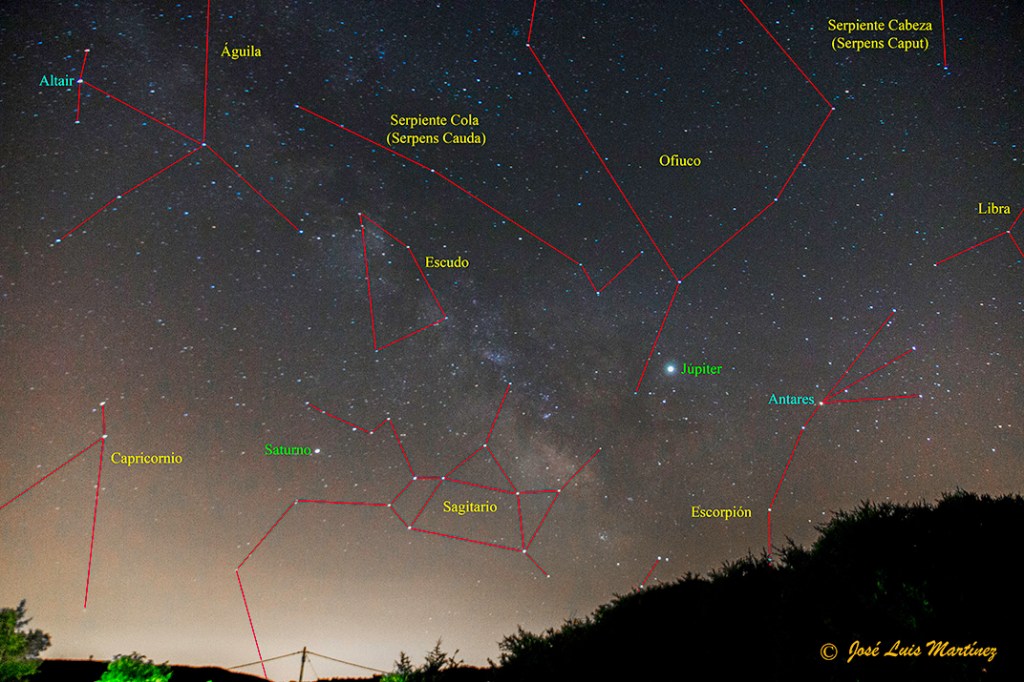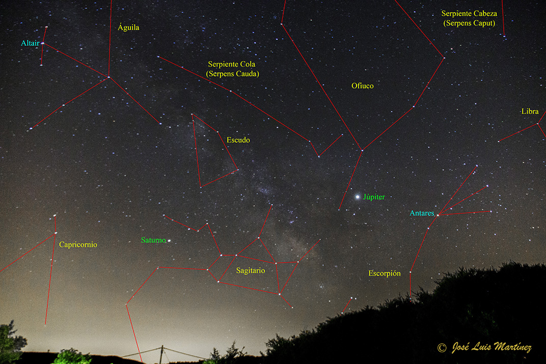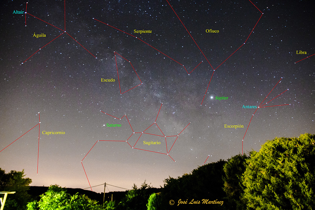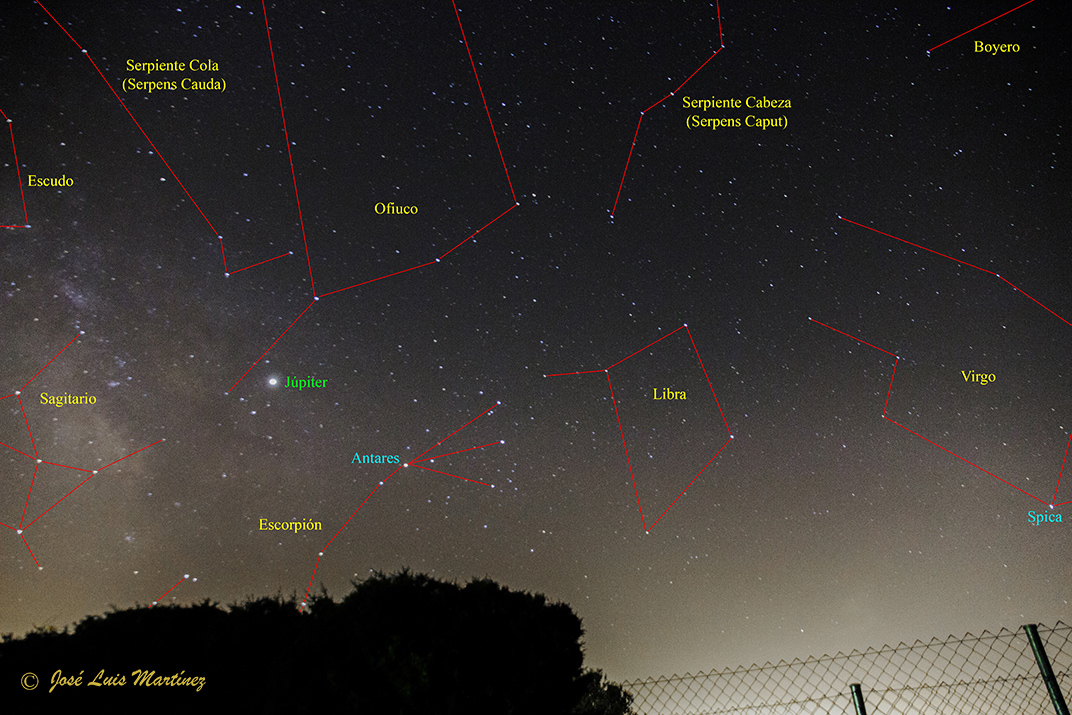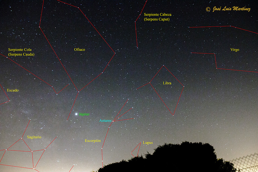 Moví la cámara un poco más al sur para coger también al Escorpión y Sagitario de lleno, con la Vía Láctea de fondo. También estaba Júpiter, que por esas fechas estaba en Ofiuco. A esta zona le hice las dos fotografías siguientes.