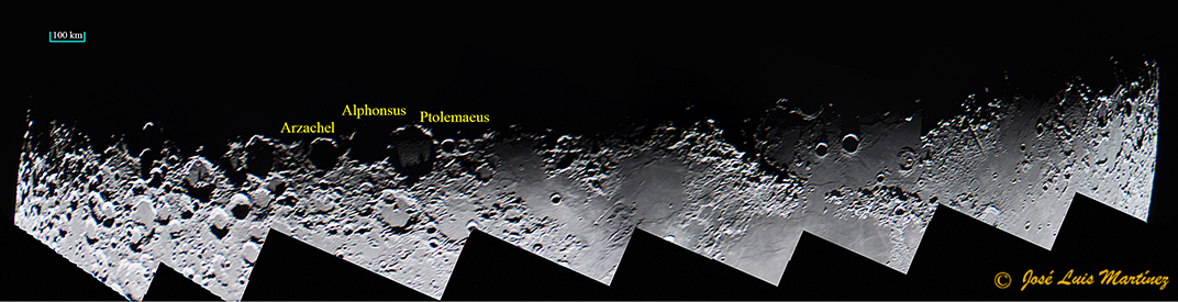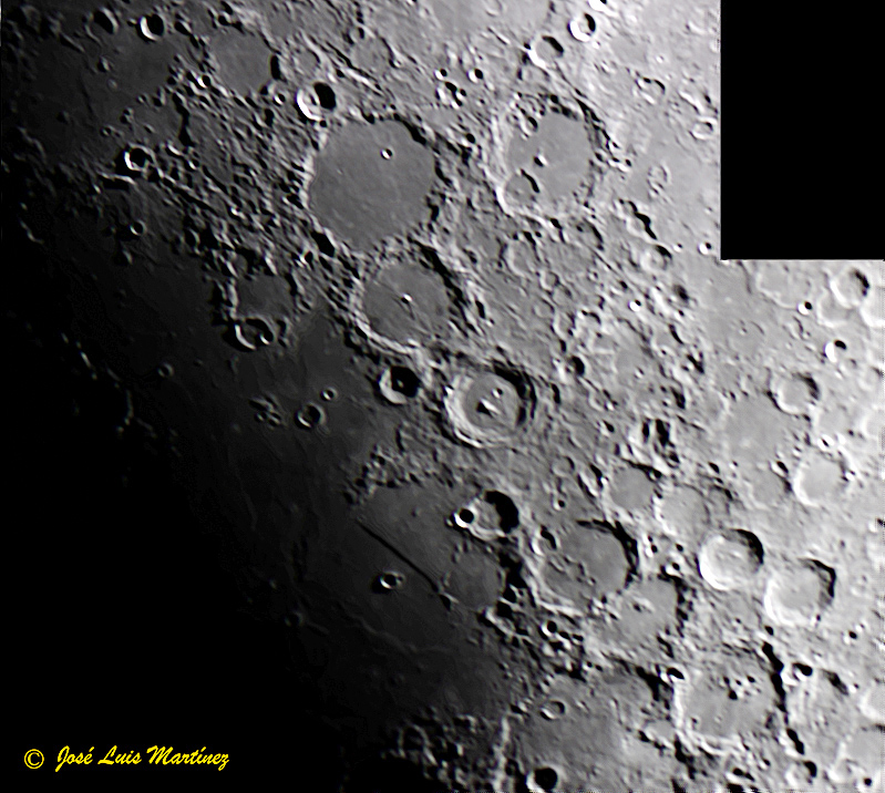 La imagen siguiente es un mosaico de diversas fotos del terminador de la Luna de 6 días, realizadas también con el Schmidt Cassegrain y la DBK y desde Cornellà de Llobregat, pero el día 26 de junio de 2012. Se puede observar que este trío de cráteres ya empiezan a asomar, aunque todavía habremos de esperar un día más (cuarto creciente), para verlos bien.