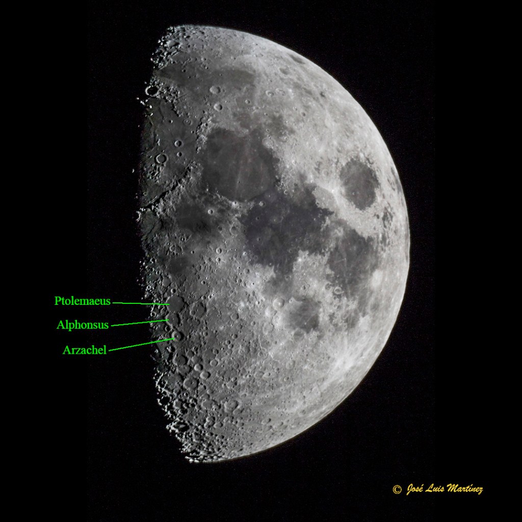 Cuando la Luna está en su mitad, esto es, en cuarto creciente o en cuarto menguante se observan, hacia el centro de nuestro satélite y en la zona del terminador, tres hermosos y famosos cráteres, Ptolemaeus, Alphonsus, y Arzachel, visibles con unos prismáticos, y una curiosa falla en forma de espada, Rupes Recta, conocida también como la espada de la Luna y, para la cual, necesitamos ya de un telescopio para observarla.