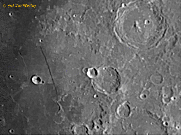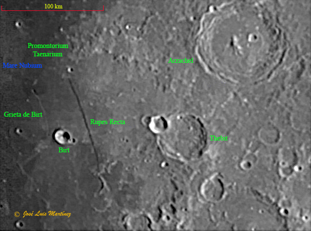 La imagen siguiente, que es un mosaico de dos fotografías, realizadas desde Cornellà de Llobregat el día 26 de mayo de 2015, con un telescopio Schmidt Cassegrain Celestron 203/2032 y una cámara DBK 21AU04, es de esta zona de la Luna. Rupes Recta está muy metida en la zona oscura y no se aprecia muy bien.