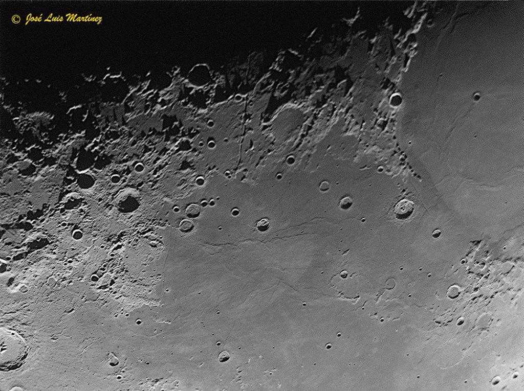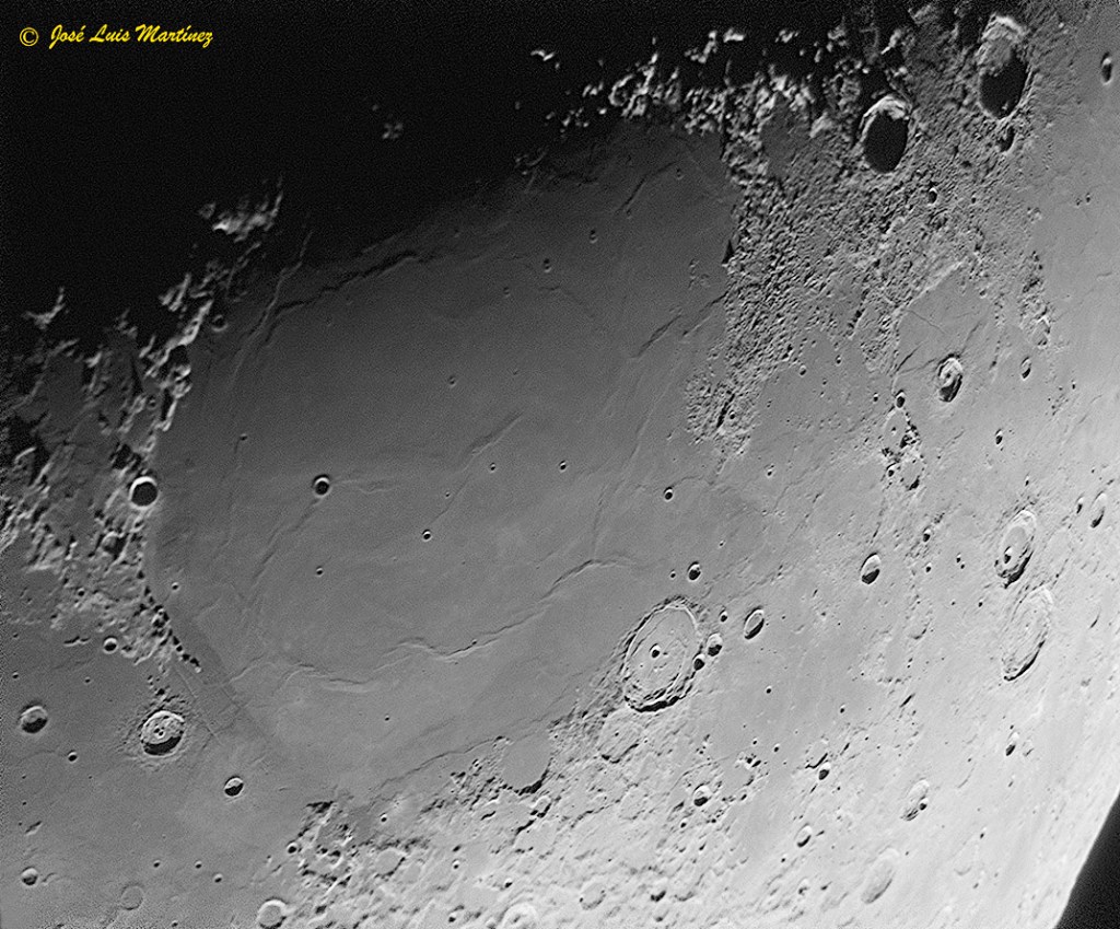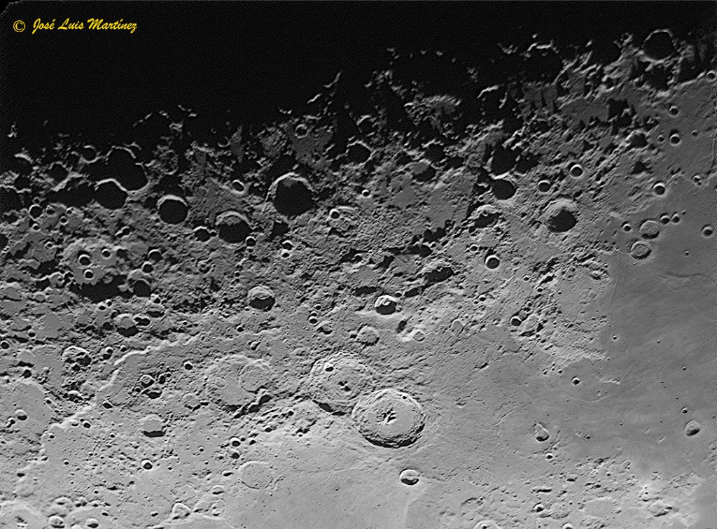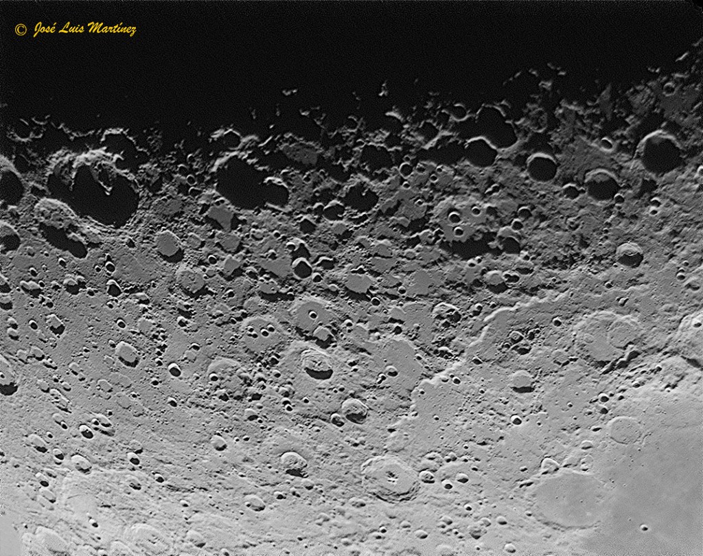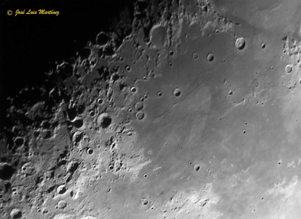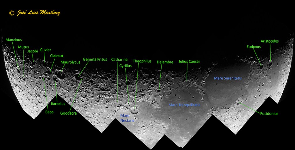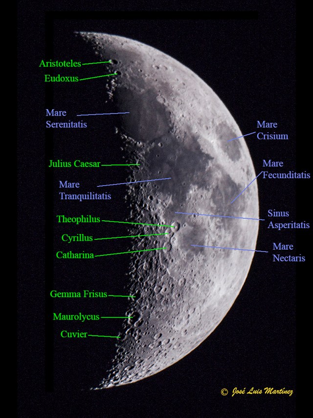 Se pueden distinguir perfectamente los cráteres más importantes, Aristoteles y Eudoxus en el norte, el trío Theophilus, Cyrillus y Catharina en el centro y Maurolycus y Cuvier en el sur y, evidentemente, los mare (Crisium, Fecunditatis, Nectaris, Serenitatis y Fecunditatis), tal como he indicado en la imagen de la derecha.
