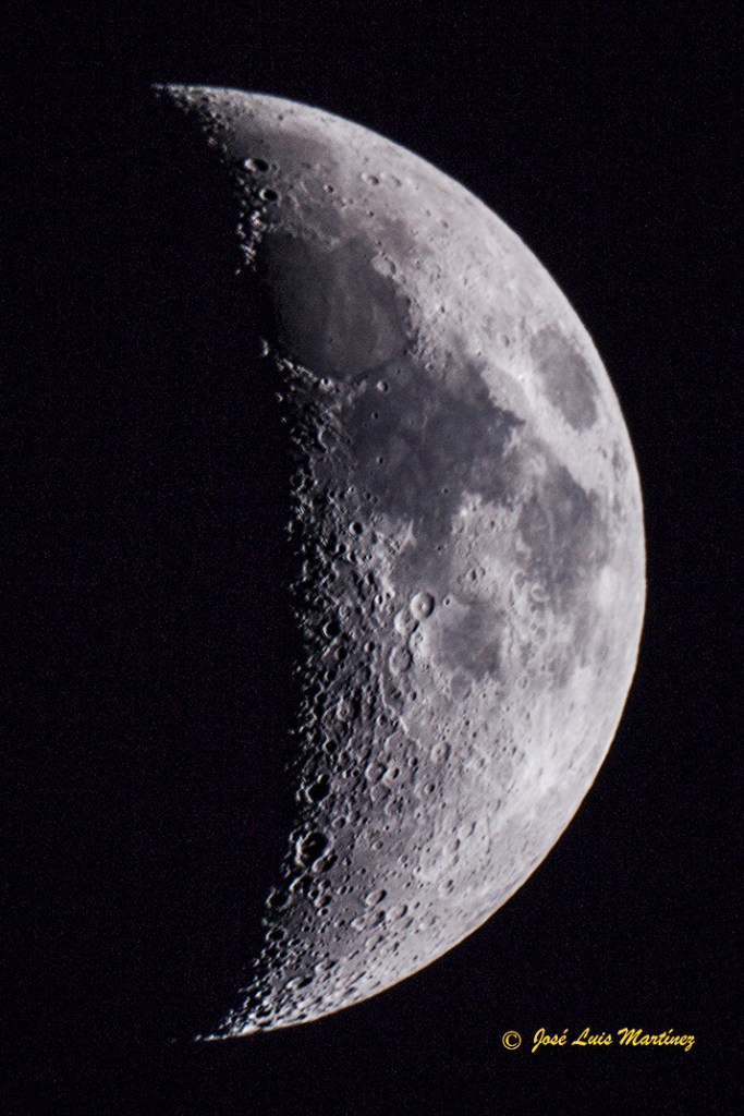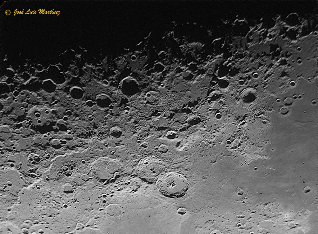 La imagen siguiente, realizada el mismo día y con el mismo equipo que la fotografía que abre el artículo, forma parte de una serie de seis fotografías que realicé para formar un mosaico del terminador y que incluí en el artículo Luna creciente de 5 días. Sin embargo, para hacer la foto que abre el artículo le puse una lente barlow, la cual duplica la focal del telescopio y, por tanto, el aumento. Bien, en esta imagen podemos ver diversas formaciones interesantes en la zona de Theophilus, Cyrillus y Catharina.
