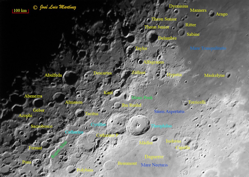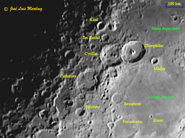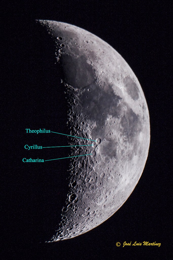Cuando la Luna está creciente de cinco días o bien menguante cinco días después de llena, podemos observar, más o menos por el centro, tres cráteres muy característicos, Theophilus, Cyrillus y Catharina, los cuales, cuando uno empieza en esta afición, suelen confundirse con otros tres cráteres muy característicos de nuestro satélite, Ptolemaeus, Alphonsus y Arzachel.
