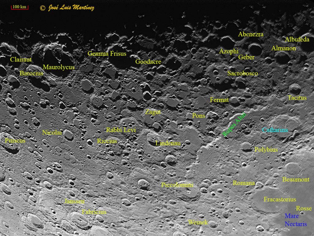 Al este de Catharina encontramos una cadena montañosa, Rupes Altai, que se extiende a partir del cráter Tacitus y hacia el sur de éste unos 480 km, hasta el cráter Piccolomini, con una altura promedio de 1000 metros, aunque en algunos puntos llega a los 3000 metros. En la siguiente imagen, realizada también desde Cornellà de Llobregat el día 28 de mayo de 2020 y con el mismo equipo, puede verse esta cadena montañosa en toda su extensión.
