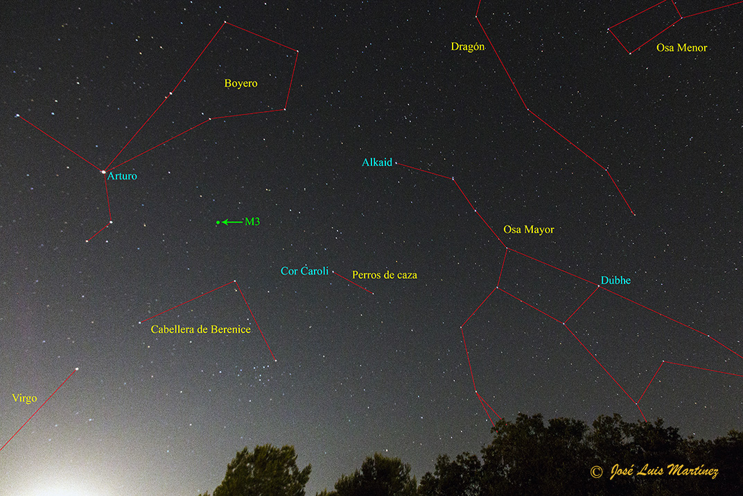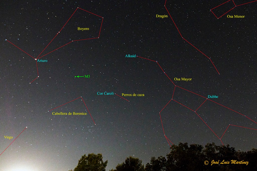 En la constelación de los Perros de Caza (Canes Venatici), más o menos a medio camino de Cor Caroli (α CVn), la estrella más brillante de Canes Venatici y Arturo (α Boo), la estrella más brillante del Boyero, aunque más cerca en el cielo de ésta que de aquélla, se encuentra uno de los cúmulos globulares mayores e impresionantes del hemisferio norte, superado únicamente por M13, el Gran cúmulo de Hércules, el objeto Messier 3 (M3).