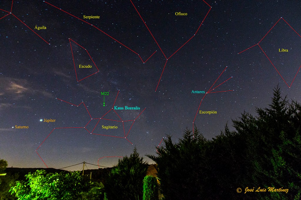 M22, que es uno de los cúmulos globulares más brillantes, es fácil de localizar, ya que se encuentra a 2,5 grados al noreste de la estrella Kaus Borealis (λ Sgr). La imagen siguiente, realizada desde Querol el día 27 de junio de 2020 con una cámara Canon EOS 70D y un objetivo Canon 15-85, muestra la ubicación de este cúmulo globular en el cielo (coordenadas ⇒ AR: 18h 36m 24s / Dec: -23º 54′ 17″).