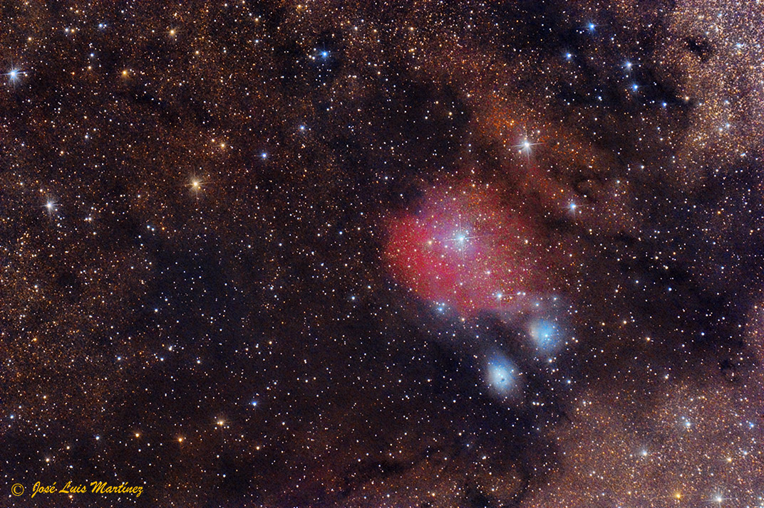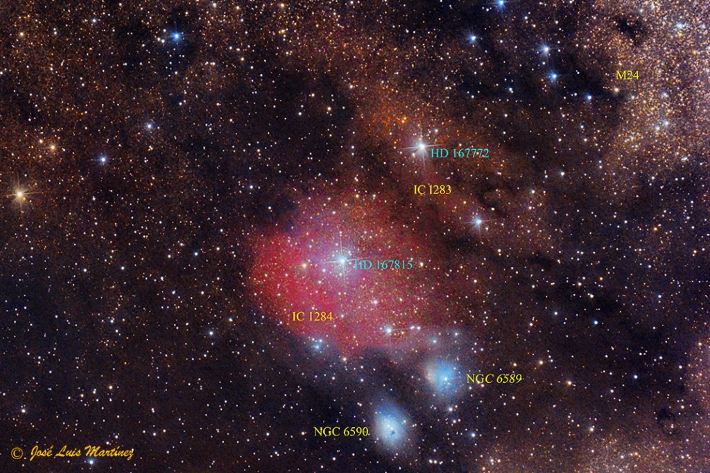 De todas maneras, por lo que he estado leyendo, parece ser que la designación más unánime es la que he mencionado e indicado en la imagen anterior: IC 1284 es la nebulosa de emisión central, IC 1283 es la nebulosa de emisión alargada por encima de la anterior, NGC 6589 es la nebulosa de reflexión por debajo y hacia la derecha de IC 1284, NGC 6590 es la nebulosa de reflexión por debajo y hacia la izquierda de IC 1284 y NGC 6595 es el cúmulo abierto situado en la zona de NGC 6590.