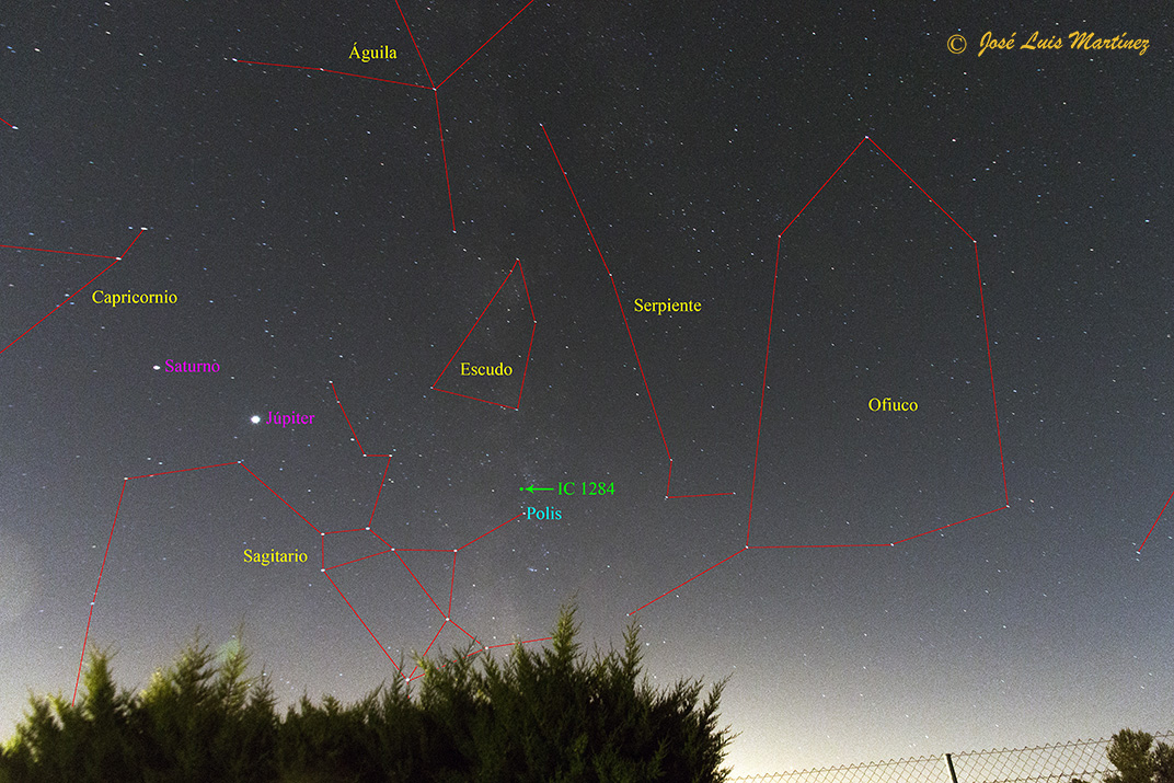 En la imagen siguiente, realizada también desde Querol el día 11 de julio de 2020, pero con una cámara Canon EOS 70D y un objetivo Canon 15-85, he indicado la ubicación en el cielo de esta zona, en concreto de IC 1284 (coordenadas ⇒ AR: 18h 17m / Dec: -19º 53′), «muy cerca» de la estrella Polis (μ Sgr).