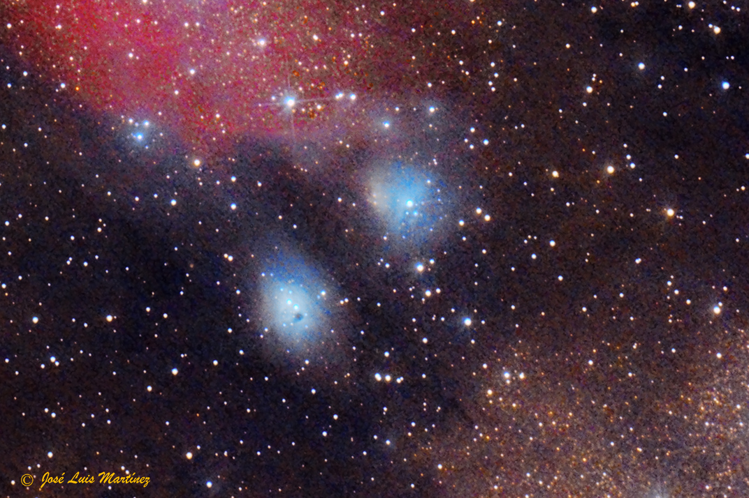 La imagen siguiente, otro recorte de la fotografía que abre el artículo, muestra con más detalle estas dos nebulosas de reflexión.