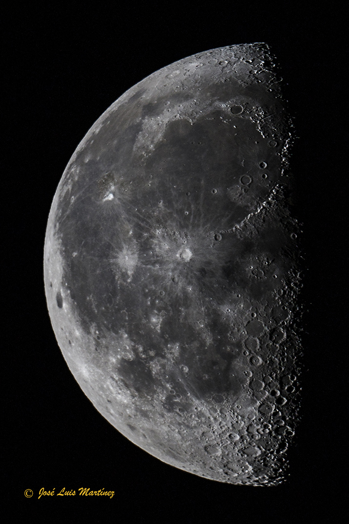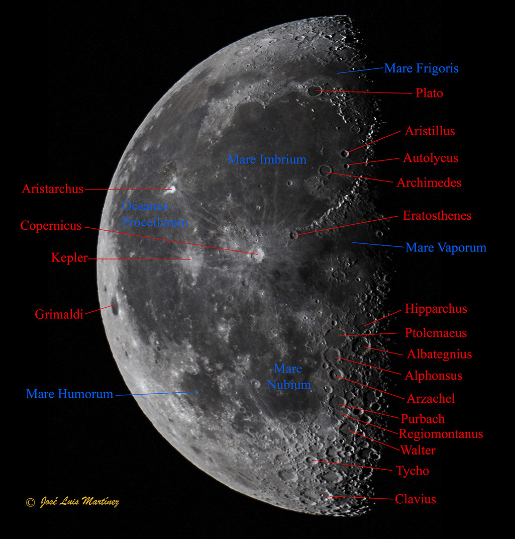 Se veían perfectamente los tres cráteres más emblemáticos de la Luna, Plato en el norte, Copernicus en el centro y Tycho en el sur. La zona sur del terminador de la Luna estaba impresionante con sus numerosos cráteres y, aunque no estaban en el terminador, también se podían observar perfectamente el trío Ptolemaeus, Alphonsus y Arzachel y, cerquita de Tycho, Clavius.