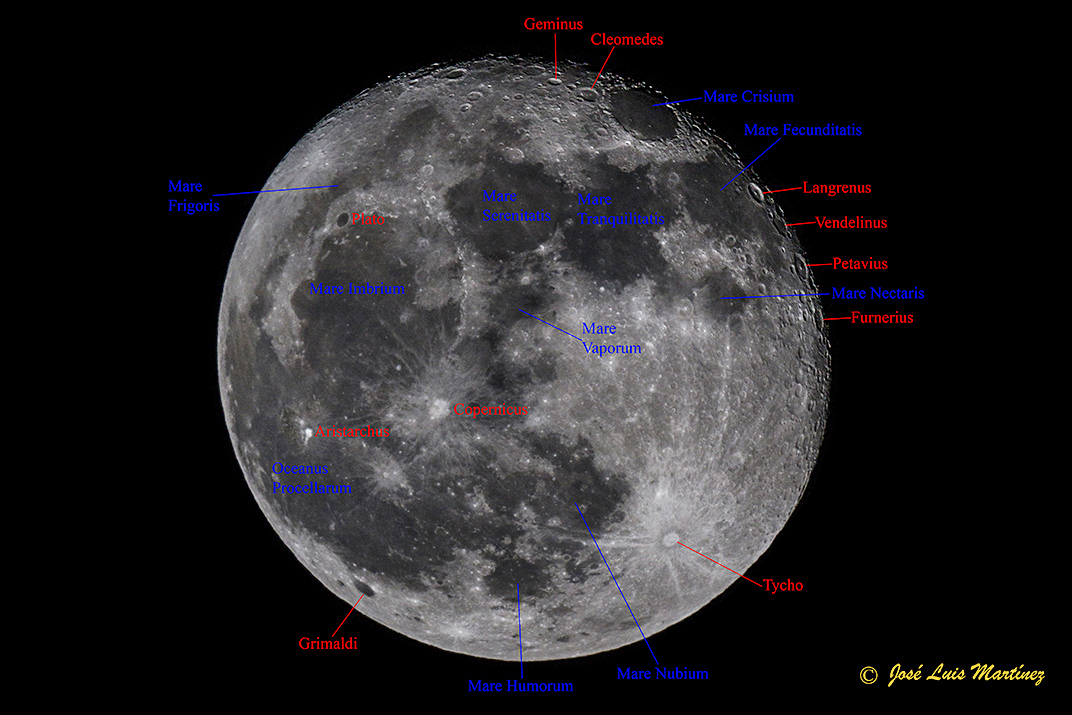 En la siguiente imagen, que es la misma que la anterior, he indicado estos cráteres que destacan, así como los mare de la Luna.
