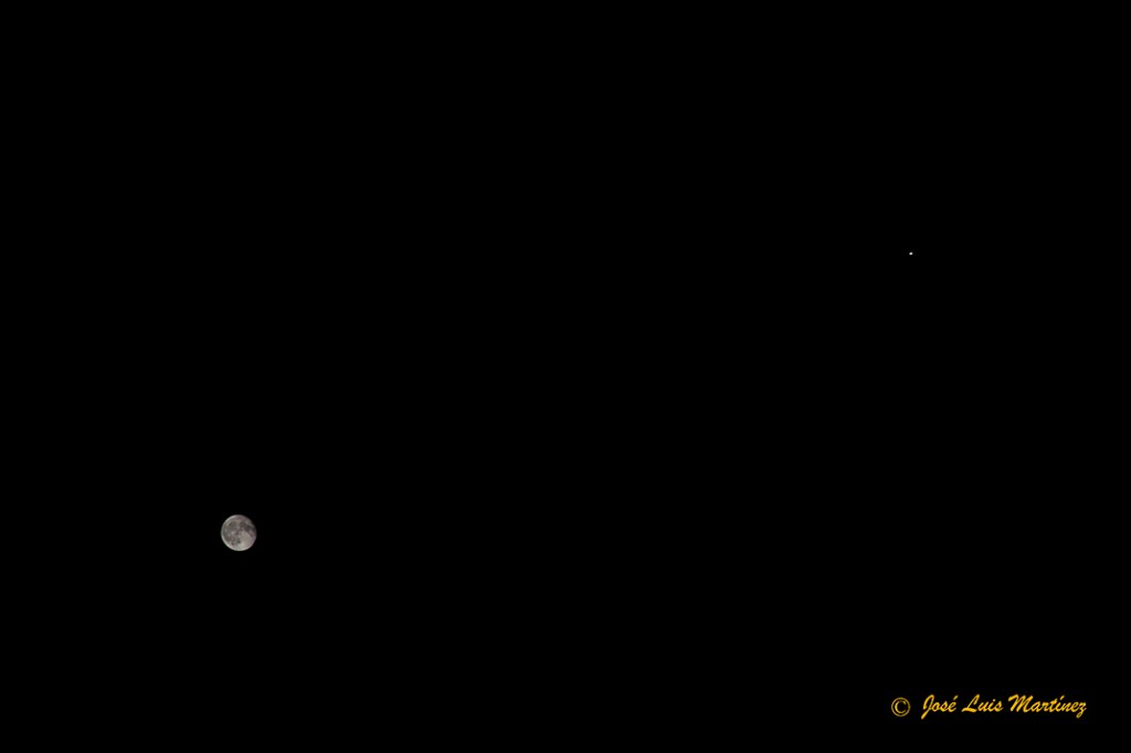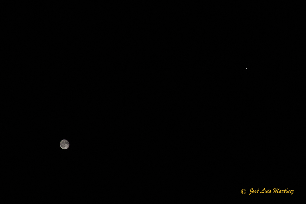 Ese día, además, Marte y la Luna estaban cerca en el cielo, como se puede ver en la imagen siguiente, realizada también desde Querol, pero sin telescopio, con una cámara Canon EOS 70D y un objetivo Canon 15-85. Marte es el puntito que se ve en la zona derecha y un poco superior de la fotografía.