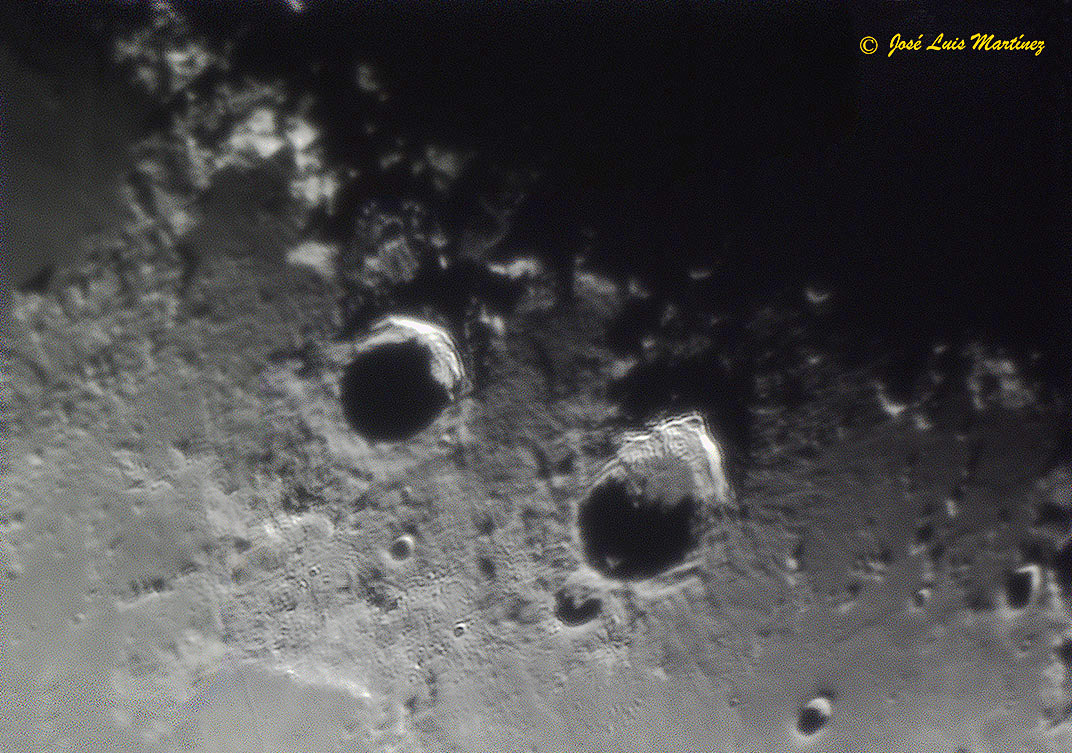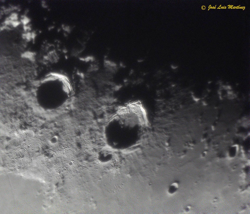 En esta imagen, donde las sombras no invaden tanto los cráteres, se observan mejor las paredes en terrazas y las colinas en el interior de ambos cráteres.