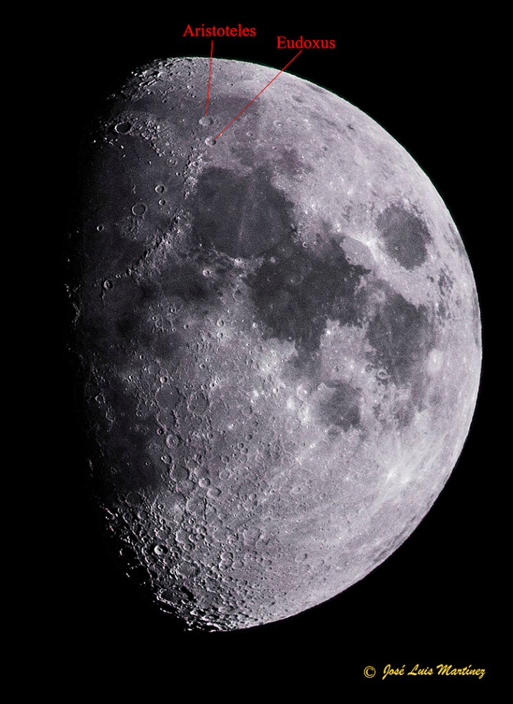 Cuando la Luna está creciente en su sexto día, esto es, un día antes del cuarto creciente, en la zona norte del terminador se observan dos cráteres muy interesantes, Aristoteles y Eudoxus.