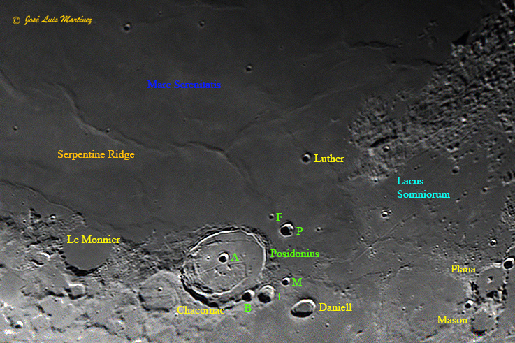 En el extremo norte de esta cresta, al noreste del Mare Serenitatis, destaca el cráter Posidonius, un cráter que casi se merece un artículo. Posidonius, cuyo nombre es en honor a otro sabio griego, pero del siglo II a. C., Posidonio de Apamea, es un cráter de impacto antiguo de 95 km de diámetro y 2,3 km de profundidad, que tiene una serie de pecularidades.