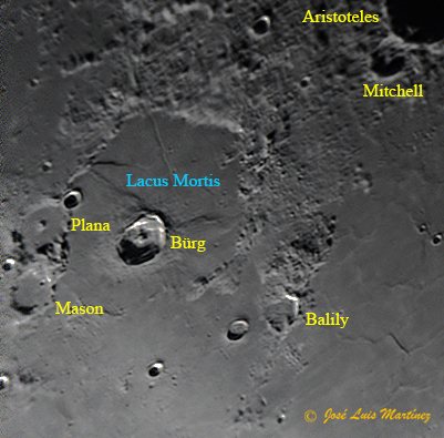 En la imagen siguiente, que es un recorte de la otra fotografía del mosaico de los alrededores de Aristoteles y Eudoxus, podemos ver el Lacus Mortis y sus alrededores.