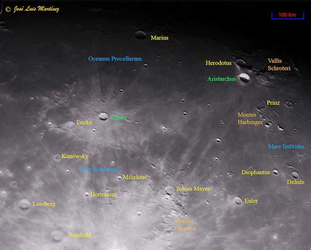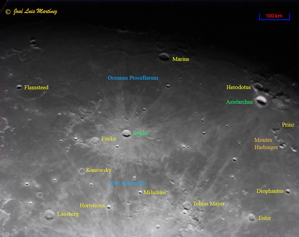 Cuando la Luna está en fase avanzada, sobre los días décimo y onceavo, podemos observar en el terminador dos cráteres bastante interesantes, Kepler y Aristarchus.
