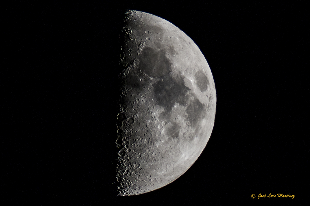 Dos días después, con la Luna ya en cuarto creciente y esta vez con telescopio (el refractor Long Perng ED80) y con el cuerpo de la EOS 70D, le hice la siguiente fotografía.