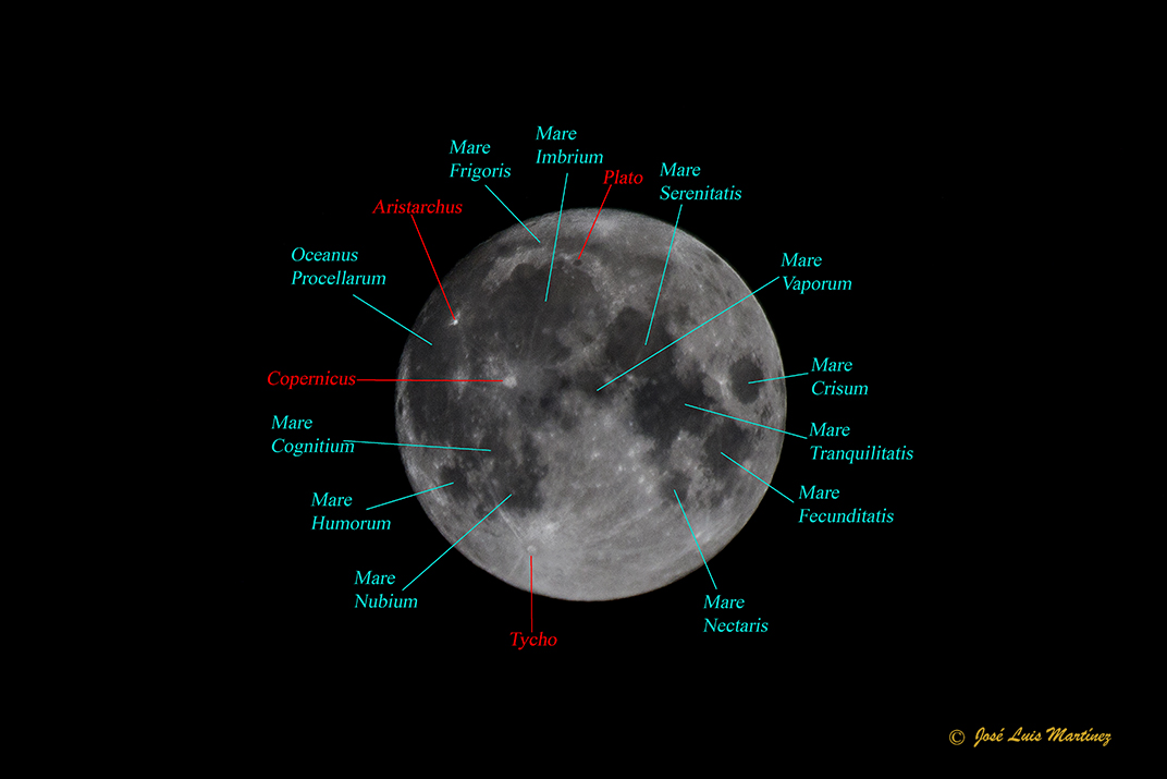 Con esta iluminación tan potente de la Luna, únicamente se pueden observar los mare y algunos cráteres como el negro Plato en el norte, el brillante Aristarchus en el oeste, el majestuoso Copernicus en el centro o el perfecto Tycho en el sur.