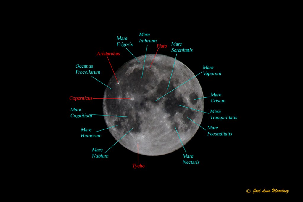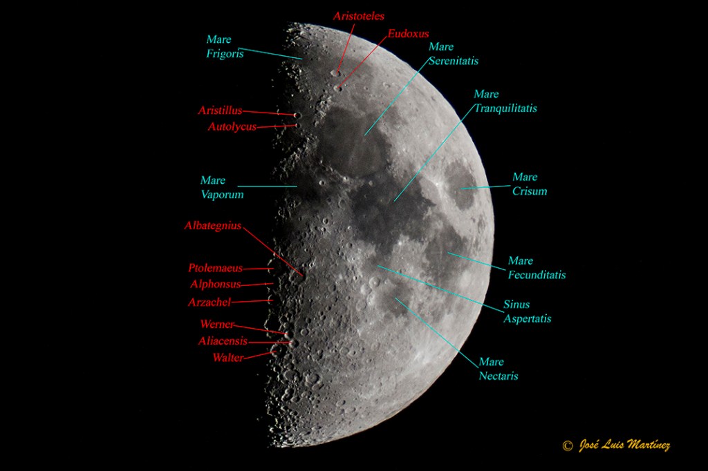 En la siguiente imagen, que es la misma que la anterior, he indicado los mare y los cráteres mencionados.