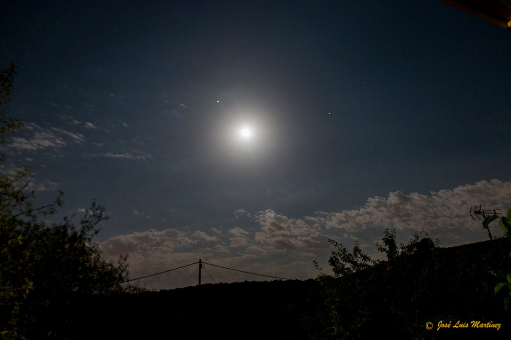 El cielo estaba bastante nublado, por lo que no monté telescopio alguno. Además, con la Luna tan potente, poco cielo profundo podía ver. Así que me limité a hacerle unas fotos a nuestro satélite con cámara y objetivo, ya que la zona de la Luna era la única parte del cielo en que las nubes iban dejando algún claro de vez en cuando.