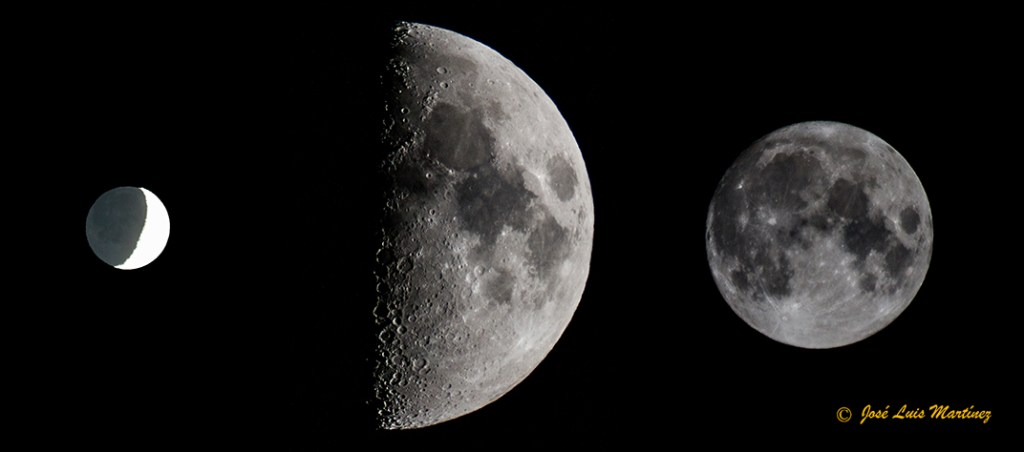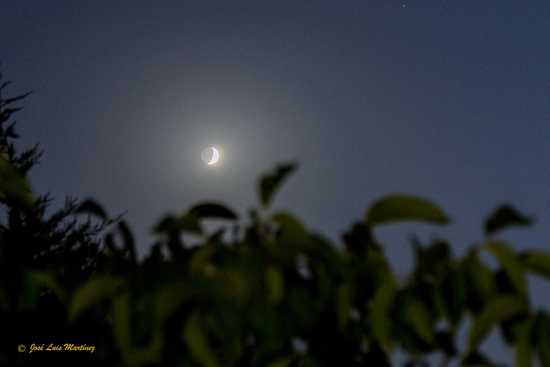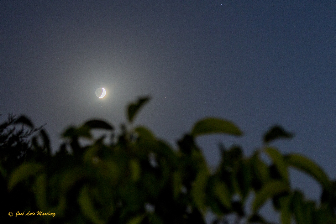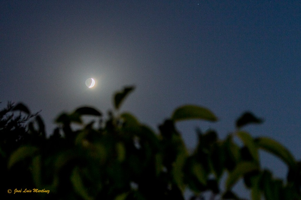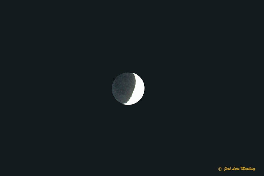 Ese día, la Luna estaba creciente con una edad de cinco días y una iluminación del 28%, ideal para observar y fotografiar la luz cenicienta de la Luna. Cuando está así, de pocos días (antes de cuarto creciente) o de muchos (después de cuarto menguante), podemos observar la parte oscura que no está iluminada por el Sol. Pero entonces, ¿por qué se ve? Vemos esta zona porque la ilumina la Tierra. Es decir, la luz del Sol reflejada en la Tierra ilumina la Luna con esta luz cenicienta. Evidentemente, a medida que la iluminación directa del Sol va creciendo, esta luz cenicienta es más tenue hasta que ya no se hace perceptible.