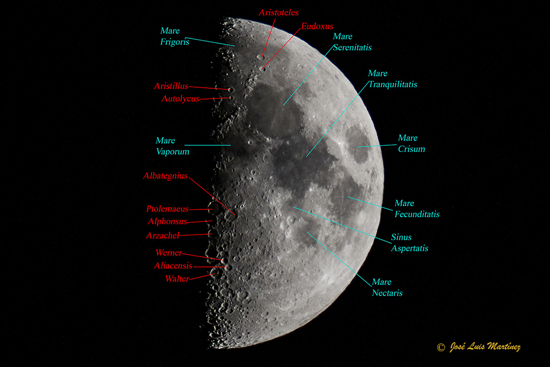 En esta fase, además de los mare de la zona oriental de nuestro satélite, se observan bastantes cráteres en el terminador (frontera entra el día y la noche selenita). Entre ellos tenemos Aristoteles, Eudoxus, Aristilus y Autolycus en el norte, el bonito trío Ptolemaeus, Alphonsus y Arzachel en el centro y muchos más en el sur.