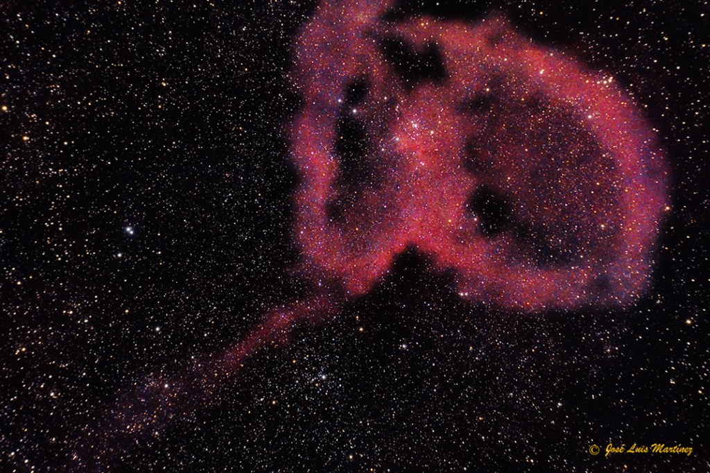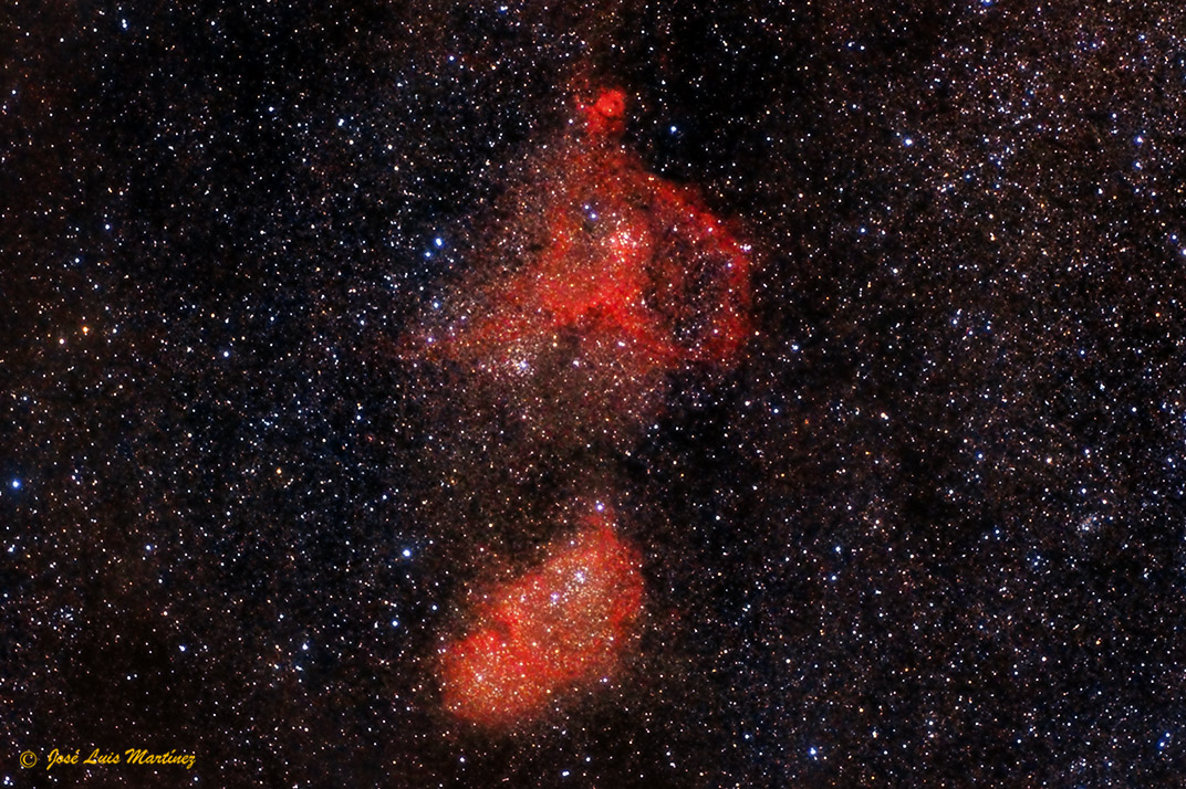 Esta fotografía la realicé el mismo día que la del complejo de nebulosas en Cefeo, NGC 7822, teniendo los mismos problemas que tuve al fotografiar dicho complejo. La nebulosa del Corazón es un objeto bastante amplio, por lo que utilicé un reductor de focal para que entrara toda ella en la imagen. Pero debido a que la alineación de la montura que hice no fue muy fina, me quedó un poco desencuadrada y no me salió entera. Además, como consecuencia de la ola de calor con polvo sahariano en suspensión que tuvimos aquellos días, la Luna en fase creciente y las luces de Vilafranca, todo ello hizo que las tomas salieran muy blancas (sobreexpuestas) y no pudiese encuadrar mejor a posteriori. Por otro lado, todo esto también hizo que no salieran todas las nebulosidades en su esplendor. Así que, la nebulosa del Corazón, es un objeto pendiente de volver a fotografiar.