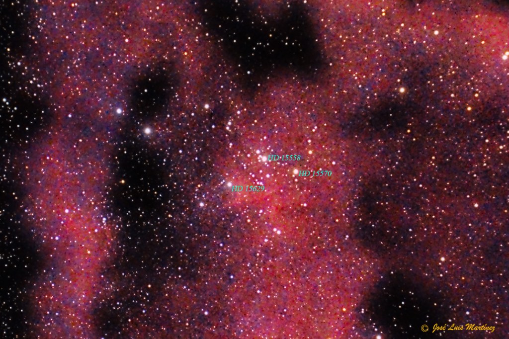 El cúmulo IC 1805, incluido también en los catálogos de Melotte (Mel 15) y de Collinder (Cr 26) que, como he comentado, pertenece a la asociación estelar Cassiopeia OB6, se encuentra en el centro de la nebulosa del Corazón y está formado por estrellas jóvenes (alrededor de un millón y medio de años). Entre ellas, hay varias estrellas de tipo espectral O, que son las causantes de ionizar el hidrógeno de Sh2-190 de manera que la nebulosa del Corazón brille con luz propia.