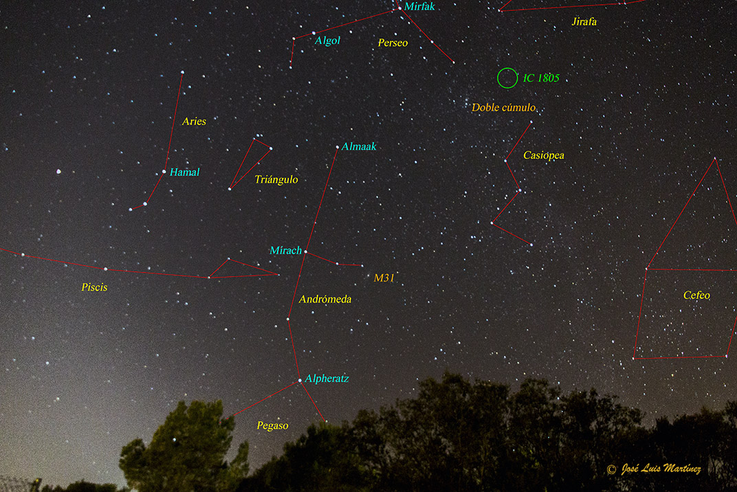 En la imagen pueden verse el doble cúmulo de Perseo y la galaxia de Andrómeda (M31). dos objetos de cielo profundo visibles a simple vista, en cielos oscuros.